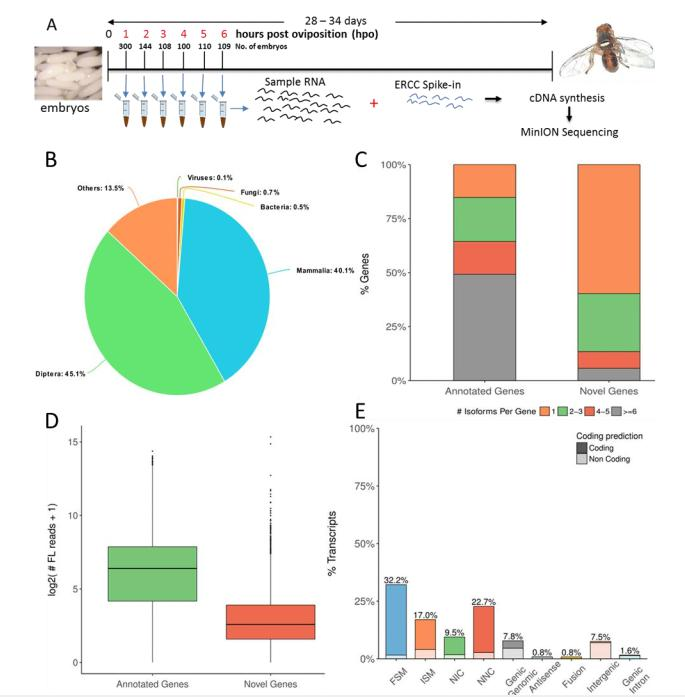 由于受精卵的興趣和令人費(fèi)解的性質(zhì),胚胎發(fā)育已在模型生物中廣泛研究。然而,在生物中沒有很好表征,長讀長RNA-seq有可能揭示迄今未知的基因,完善注釋信息,并擴(kuò)展亞型多樣性。作者匯集了混合性別橄欖果蠅(Bactroceraoleae)胚胎,這些胚胎在產(chǎn)卵的前6個(gè)小時(shí)后每小時(shí)收集一次。這些時(shí)期的研究很有意義,因?yàn)橹皩?duì)B.oleae的研究表明,在此期間開始通過基因的可變剪接介導(dǎo)的性別決定機(jī)制。此外,來自地中海實(shí)蠅(Ceratitiscapitata)的證據(jù)表明,在此期間發(fā)生極細(xì)胞(原始生殖細(xì)胞)的建立,因此,在此期間闡明轉(zhuǎn)錄狀態(tài)非常重要。