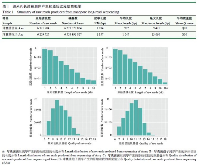 圖1球囊菌菌絲和孢子納米孔長讀段測序的原始讀段長度和質(zhì)量值分布Fig.1Lengthandqualitydistributionofrawreadsgeneratedfromnanoporelong-readsequencingofA.apismyceliumandspore