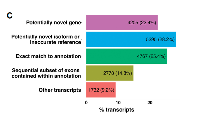 作者接著對(duì)全長(zhǎng)轉(zhuǎn)錄組對(duì)已注釋基因鑒定到的未記錄的轉(zhuǎn)錄本的可變剪切形式的研究。 由于斑馬魚(yú)參考基因組對(duì)可變剪切的注釋較少,文章使用短讀長(zhǎng)的轉(zhuǎn)錄組數(shù)據(jù)對(duì)可變剪切位 點(diǎn)進(jìn)行驗(yàn)證。作者使用 STAR 軟件分析轉(zhuǎn)錄組數(shù)據(jù),預(yù)測(cè)了 3000 個(gè)可變剪切位點(diǎn),其中 99% 可以與全長(zhǎng)轉(zhuǎn)錄本數(shù)據(jù)吻合。剪接位點(diǎn)的這種近乎完美的一致性支持證明了全長(zhǎng)轉(zhuǎn)錄組鑒定 的外顯子 – 內(nèi)含子邊界的準(zhǔn)確性,并強(qiáng)烈支持新檢測(cè)到的可變剪接形式的有效性。通過(guò)全 長(zhǎng)轉(zhuǎn)錄組共發(fā)現(xiàn)了 2000 種新型可變剪切類型,其中已注釋基因的新型可變剪切共 1835 中, 平均每個(gè)基因的可變剪切類型提升 50%。