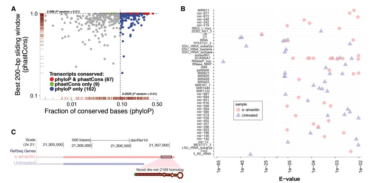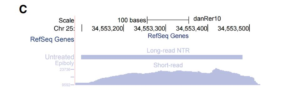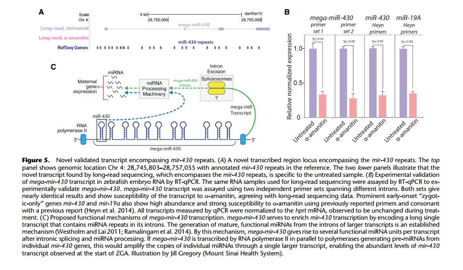 通過(guò)全長(zhǎng)轉(zhuǎn)錄組鑒定到的大量新轉(zhuǎn)錄本中包括了一種重要 miRNA- miR-430,mir-430 可能是第一個(gè)表達(dá)的合子基因,它通過(guò)對(duì)所有母源轉(zhuǎn)錄基因進(jìn)行的特異性沉默和降解將合子 基因的啟動(dòng)和母體程序的消除連接起來(lái)。在以前的研究中,對(duì)其功能研究較多,而對(duì)于 miR-430 的來(lái)源研究較少。作者鑒定到了一個(gè)新的跨越 9kb 基因組序列的四外顯子轉(zhuǎn)錄本, 該轉(zhuǎn)錄本重疊 22 個(gè) mir-430 重復(fù)序列,被稱為“mega-mir-430”。 在α-amanitin 處理中沒(méi) 有檢測(cè)到 mega-mir-430,并通過(guò) qPCR 進(jìn)行了驗(yàn)證,推斷它來(lái)源于合子基因組。從每個(gè) mega-mir-430 轉(zhuǎn)錄本產(chǎn)生多個(gè) mir-430 的拷貝,這個(gè)發(fā)現(xiàn)解釋了合子基因激活時(shí) mir-430 高表達(dá)的原因。