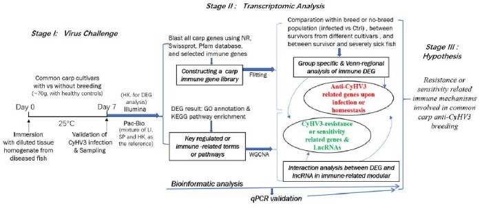 鯉魚(yú)皰疹病毒-3(CyHV-3)感染是鯉魚(yú)養(yǎng)殖的主要威脅,可導(dǎo)致鯉魚(yú)大量的死亡。CyHV-3可通過(guò)削弱宿主的免疫系統(tǒng)而使其死亡,導(dǎo)致其對(duì)病原微生物易感性,并可能在感染后6至10天內(nèi)出現(xiàn)發(fā)病和死亡。感染CyHV-3后存活下來(lái)的鯉魚(yú)可以抵抗這種病毒未來(lái)的感染。由于CyHV-3在鯉魚(yú)中存在潛伏期和持續(xù)性攜帶期,遺傳背景對(duì)于了解對(duì)病毒的耐藥性至關(guān)重要。德國(guó)鏡鯉品系G4是中國(guó)廣泛栽培的鯉魚(yú)品系,但因CyHV-3病毒引起高死亡率。然而目前在研究抗CyHV-3免疫機(jī)制的詳細(xì)免疫系統(tǒng)網(wǎng)絡(luò)方面,還缺乏系統(tǒng)的研究。最近的研究表明,lncRNAs在不同類(lèi)型病原體感染時(shí)的廣泛差異表達(dá),表明lncRNAs在魚(yú)類(lèi)免疫反應(yīng)中起著關(guān)鍵作用。然而,在CyHV-3感染期間,鯉魚(yú)體內(nèi)的特異性L(fǎng)ncRNA對(duì)免疫反應(yīng)的調(diào)節(jié)尚未被研究。第三代測(cè)序(如PacBio)可以解碼比第二代測(cè)序方法(如Illumina)更長(zhǎng)的基因序列,包括mRNA和非編碼RNA在內(nèi)的更高質(zhì)量的轉(zhuǎn)錄本組裝,可能提供對(duì)遺傳抗性機(jī)制的更詳細(xì)理解。在本研究中,為了揭示鯉魚(yú)抗CyHV3育種中涉及的免疫機(jī)制,使用圖1所示的策略,對(duì)CyHV-3激發(fā)期間的mRNA和長(zhǎng)非編碼RNA(lncRNA)進(jìn)行了整合轉(zhuǎn)錄組學(xué)分析。對(duì)來(lái)自繁殖品系或非繁殖品系的存活鯉魚(yú)和健康對(duì)照鯉魚(yú)的免疫相關(guān)轉(zhuǎn)錄本進(jìn)行了分析。