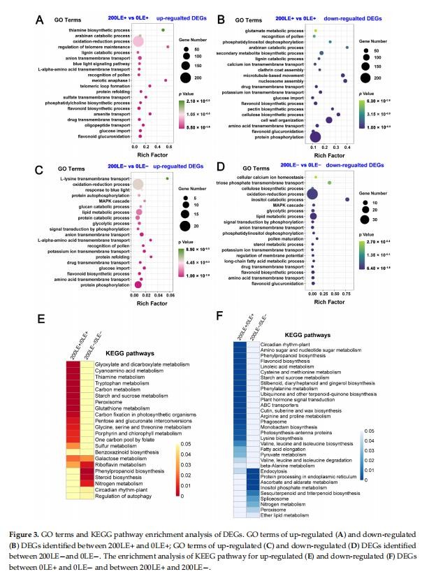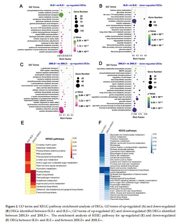E.gansuensis上調(diào)1269個(gè)基因,下調(diào)1195個(gè)0LE+基因(葉E+植物在0mMNaCl下)與0LE-(E-植物在0mMNaCl下的葉子)相比。類似地,E.gansuensis誘導(dǎo)844個(gè)基因并抑制200LE+(E+植物的葉子)的973個(gè)基因在200mMNaCl下)與200LE-(E-植物的葉子在200mMNaCl下)相比(圖1)。目前的結(jié)果表明在NaCl脅迫下E.gansuensis對基因的調(diào)控有巨大的影響與200mMNaCl相比。對0LE+和0LE-之間的DEGs進(jìn)行GO富集分析發(fā)現(xiàn),E.gansuensis主要誘導(dǎo)“鈉離子跨膜轉(zhuǎn)運(yùn)”、“胚胎后發(fā)育的正調(diào)控”、“蛋白質(zhì)磷酸化”、“光系統(tǒng)化學(xué)計(jì)量調(diào)整”和“谷氨酸代謝過程”(圖2A)。此外,GO富集分析表明,類別“類黃酮葡萄糖醛酸化”、“類黃酮生物合成過程”、“氧化-還原”過程”和“陰離子跨膜轉(zhuǎn)運(yùn)”在下調(diào)中富集E.gansuensis在0mMNaCl濃度下的DEGs(圖2B)。這些結(jié)果暗示E.gansuensis重新編排了植物生理學(xué)和重要生物學(xué)的許多方面提高寄主植物的競爭力。GO富集分析在200LE+和200LE?之間的DEGs表明,E.gansuensis主要誘導(dǎo)“蛋白質(zhì)磷酸化”、“氧化還原過程”、“油菜素類固醇生物合成過程”、“細(xì)胞鈣離子穩(wěn)態(tài)”和“L-谷氨酸轉(zhuǎn)運(yùn)”(圖2C);此外,GO富集分析發(fā)現(xiàn)“蛋白質(zhì)磷酸化”的類別,“果糖6-磷酸代謝過程”、“類黃酮生物合成過程”和“MAPK”在200mMNaCl濃度下,E.gansuensis在下調(diào)的DEG中富集級(jí)聯(lián)”(圖2D)。我們的研究結(jié)果表明,E.gansuensis通過激活細(xì)胞信號(hào)轉(zhuǎn)導(dǎo)促進(jìn)宿主在脅迫環(huán)境下的生長,維持平衡。促進(jìn)ROS、Ca2+信號(hào)和油菜素類固醇(BR)的生物合成,它們在抗壓過程中起作用。