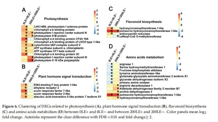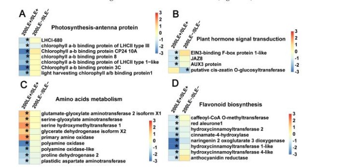 E.gansuensis顯著激活10個(gè)基因和5個(gè)光合作用基因分別為0mM和200mMNaCl濃度下。E.gansuensis的作用寄主植物的光合作用基因更明顯在0mMNaCl下比200mM氯化鈉(圖6A)。此外,E.gansuensis顯著激活植物的五個(gè)信號(hào)傳導(dǎo)基因在0mMNaCl濃度下;這些基因包括乙烯信號(hào)通路的兩個(gè)基因、生長素信號(hào)通路的兩個(gè)基因和脫落酸信號(hào)通路的一種基因。然而,E.gansuensis沒有顯著激活植物激素信號(hào)轉(zhuǎn)導(dǎo)基因在200mMNaCl濃度13下(圖6B),這意味著NaCl的影響大于E.gansuensis在植物激素基因表達(dá)方面的研究。E.gansuensis顯著下激活植物激素信號(hào)轉(zhuǎn)導(dǎo)基因在0mMNaCl濃度下,但E.gansuensis在200mMNaCl濃度下顯著調(diào)控兩個(gè)類黃酮生物合成基因(圖6C)。E.gansuensis顯著抑制氨基的八個(gè)基因在0mMNaCl濃度和E.gansuensis的酸代謝顯著激活下激活植物激素信號(hào)轉(zhuǎn)導(dǎo)基因在200mMNaCl濃度下的(圖6D)。更遠(yuǎn),E.gansuensis顯著下調(diào)甘氨酸、絲氨酸和蘇氨酸代謝,以及作為色氨酸代謝在0mMNaCl濃度下。E.gansuensis顯著下調(diào)賴氨酸降解,上調(diào)精氨酸和脯氨酸代謝在200mMNaCl下。因此,很可能,E.gansuensis通過調(diào)節(jié)宿主氨基酸代謝來提高A.inebrians的耐鹽性。
