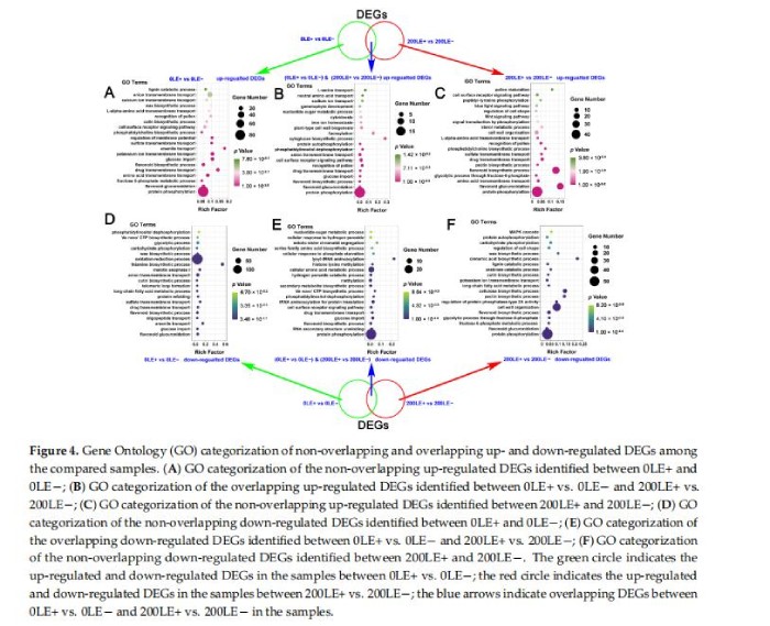 Venn結(jié)果顯示E.gansuensis僅上調(diào)1135DEG在0mMNaCl濃度下的LE+和LE-之間,E.gansuensis在200mMNaCl脅迫下僅上調(diào)LE+和LE-之間的710DEG;此外,134DEG的LE+與LE-在E.gansuensis在0mMNaCl和200mMNaCl(補(bǔ)充圖S4A)。同樣,E.gansuensis在0mMNaCl和E.gansuensis僅下調(diào)LE+和LE-之間的928DEG僅在A.inebrians中下調(diào)LE+和LE-之間的706DEG作為響應(yīng)至200mMNaCl(補(bǔ)充圖S4B)。分析結(jié)果表明這些特殊的上調(diào)或下調(diào)的LE+與LE-的DEG的GO富集0mMNaCl和200mMNaCl分別顯示磷酸化信號(hào),次生代謝物的合成和轉(zhuǎn)運(yùn),以及離子跨膜轉(zhuǎn)運(yùn)A.inebrians主要富集于E.gansuensis獨(dú)特的上調(diào)DEGs在0mMNaCl濃度下(圖4A)。GO富集分析結(jié)果表明A.inebrians的“蛋白質(zhì)磷酸化”、“類黃酮葡萄糖醛酸化”、“氨基酸跨膜轉(zhuǎn)運(yùn)”、“果糖6-磷酸代謝過程”、“類黃酮生物合成過程”和“磷酸化信號(hào)轉(zhuǎn)導(dǎo)”主要在200mM甘肅E.gansuensis獨(dú)特的上調(diào)DEG中富集NaCl濃度(圖4C)。細(xì)胞信號(hào)轉(zhuǎn)導(dǎo)通路(“蛋白磷酸化”和“細(xì)胞表面受體信號(hào)通路”)、“類黃酮生物合成A.inebrians的“過程”、“細(xì)胞表面受體信號(hào)通路”、“葡萄糖輸入”、“陰離子跨膜轉(zhuǎn)運(yùn)”和“細(xì)胞分裂”主要富集于E.gansuensis在0mMNaCl和200mMNaCl濃度下共享上調(diào)的DEG(圖4B)。E.gansuensis主要僅抑制“黃酮類葡萄糖醛酸化”、“葡萄糖輸入”、“長鏈脂肪酸代謝過程”、“黃酮類生物合成過程”、“陰離子跨膜轉(zhuǎn)運(yùn)”和“氧化還原過程”的A.inebrians,主要在獨(dú)特的下調(diào)DEG中富集由E.gansuensis在0mMNaCl濃度下(圖4D)?!暗鞍踪|(zhì)磷酸化”、“果糖6-磷酸代謝過程”、“黃酮類葡萄糖醛酸化”、“通過果糖-6-磷酸進(jìn)行糖酵解過程”,“類黃酮生物合成過程”,“調(diào)節(jié)蛋白磷酸酶2A型活性”,“鉀離子跨膜”A.inebrians的運(yùn)輸”和“MAPK級(jí)聯(lián)”主要富集于獨(dú)特的甘肅大腸桿菌在200mMNaCl濃度下下調(diào)DEG(圖4F)。細(xì)胞信號(hào)轉(zhuǎn)導(dǎo)(“蛋白質(zhì)磷酸化”和“細(xì)胞表面受體信號(hào)通路”)、次生代謝產(chǎn)物(“類黃酮”生物合成過程”、“絲氨酸家族氨基酸生物合成過程”和“細(xì)胞氨基酸代謝過程”)和“過氧化氫分解代謝過程”A.inebrians主要在0mMNaCl和200mMNaCl的E.gansuensis共享的下調(diào)DEG中富集(圖4E)。