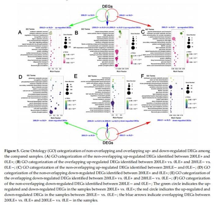 NaCl脅迫僅上調(diào)LE+和LE+之間的2015DEG,且僅NaCl脅迫在LE-和LE-之間上調(diào)139DEG(補(bǔ)充圖S4C)。氯化鈉脅迫僅在LE+和LE+之間下調(diào)4707DEG,NaCl脅迫僅下調(diào)LE-和LE-之間的290DEG(補(bǔ)充圖S4D)。分析結(jié)果這些特殊上調(diào)的DEG在0mMNaCl與200mMNaCl下的GO富集度LE+和LE-分別表明NaCl脅迫主要調(diào)節(jié)氧化還原過程、次生代謝物的生物合成、小分子轉(zhuǎn)運(yùn)和細(xì)胞信號(hào)轉(zhuǎn)導(dǎo),主要富集在LE+和LE-中獨(dú)特的上調(diào)DEGs(圖5A,C)。例如“氨基酸跨膜轉(zhuǎn)運(yùn)”、“類黃酮生物合成過程”、“鉀離子跨膜轉(zhuǎn)運(yùn)”、“葡萄糖輸入”、“L-α-氨基酸跨膜轉(zhuǎn)運(yùn)”、“陰離子跨膜轉(zhuǎn)運(yùn)”、“信號(hào)轉(zhuǎn)導(dǎo)”A.inebrians的磷酸化”、“MAPK級(jí)聯(lián)”、“氧化還原過程”和“過氧化氫分解代謝過程”主要富集于獨(dú)特的上調(diào)氯化鈉脅迫下LE-中的DEGs(圖5C)。次生物質(zhì)的代謝和運(yùn)輸代謝物(“一元10羧酸代謝過程”、“蛋白質(zhì)分解代謝過程”和“脂質(zhì)代謝過程”),ROS信號(hào)(“過氧化氫分解代謝過程”和“細(xì)胞對過氧化氫的反應(yīng)”)和A.inbrians的“蛋白質(zhì)磷酸化”主要富集分別在LE+和LE-之間的NaCl脅迫下共享上調(diào)的DEG(圖5B)。類似地,“蛋白質(zhì)磷酸化”、“類黃酮葡萄糖醛酸化”、“類黃酮生物合成過程”、“氨基酸跨膜轉(zhuǎn)運(yùn)”、“鉀離子跨膜”轉(zhuǎn)運(yùn)”、“鈣離子跨膜轉(zhuǎn)運(yùn)”和“谷氨酸代謝過程”A.inebrians主要富集在NaCl下LE+中獨(dú)特的下調(diào)DEGs壓力(圖5D)。次生代謝物的合成和轉(zhuǎn)運(yùn)(“黃酮類葡萄糖醛酸化”、“氨基酸跨膜轉(zhuǎn)運(yùn)”、“類黃酮生物合成過程”和“長鏈脂肪酸代謝過程”)、“鉀離子跨膜轉(zhuǎn)運(yùn)”、“氧化-還原過程”和信號(hào)轉(zhuǎn)導(dǎo)途徑(“磷酸化信號(hào)轉(zhuǎn)導(dǎo)”A.inebrians的“MAPKcascade”)主要富集于獨(dú)特的下調(diào)氯化鈉脅迫下LE-中的DEGs(圖5F)。次生物質(zhì)的代謝和運(yùn)輸代謝物(“氨基酸跨膜轉(zhuǎn)運(yùn)”、“脂質(zhì)代謝過程”、“氨基酸進(jìn)口”、“糖酵解過程”和“一元羧酸代謝過程”)、“陰離子跨膜轉(zhuǎn)運(yùn)”、“氧化還原過程”和“陰離子穩(wěn)態(tài)”。主要富集于LE+和NaCl脅迫下共享的下調(diào)DEGsLE-(圖5E)