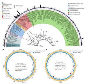 基于二三代測序混合組裝共獲得了802個CMAG,在準(zhǔn)備本手稿時,只有225個CMAG保存在公共基因組數(shù)據(jù)庫中。其中大多數(shù)(n=160)是從環(huán)境元基因組中重建的。該研究組裝的CMAG較大,從1.0 Mbps到5.5 Mbps(平均為2.4 Mbps),這個范圍涵蓋了大多數(shù)已知腸道細(xì)菌的基因組大小。為了評估目前組裝的CMAG的代表性,按照平均核苷酸同源性(ANI)95%閾值進(jìn)行物種水平基因組去冗余,然后將該數(shù)據(jù)集與統(tǒng)一人類胃腸道基因組(UHGG)中去復(fù)制的基因組進(jìn)行比較??偣脖A袅?34個種水平的CMAG,涵蓋11個門、14個綱、27個目、45個科、94個屬(圖1A和補(bǔ)充表5)。其中有131個物種水平的CMAG是之前未報(bào)道的環(huán)狀的、完整、人類特有的各自物種的代表性基因組,65個未培養(yǎng)物種的參考基因組的質(zhì)量得到了改善。這些結(jié)果表明了當(dāng)前工作流程在從復(fù)雜的宏基因組數(shù)據(jù)集和組裝挑戰(zhàn)的區(qū)域組裝完整基因組方面的能力和有效性。