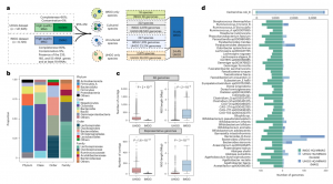 進(jìn)一步深入探索了可用的高質(zhì)量基因組中編碼的代謝潛力。分析了 UHGG 和 IMGG 數(shù)據(jù)集中的高連續(xù)性和高質(zhì)量基因組。共從15512個基因組中還原了97428個MGC區(qū)域,其中78675個是完整的,并被納入進(jìn)一步分析。這些完整的MGC屬于所有八個MGC類別,分布在58個MGC類型中。*常見的類別是SCFA(40.0%),其次是Putative(28.9%)和E-MGC(17.2%)。然后,門水平分布和聚類分析揭示了MGC類別的總體分布在門水平的顯著差異(圖4a),以及在十個主要的門之間,它們在不同門中的數(shù)量各不同(圖4a)。此外,基于涵蓋九個主要門的功能性MGC分類分布的特異性聚類表明,MGC概述和組成在門水平間存在顯著差異,這些未培養(yǎng)物種中的一些最近發(fā)現(xiàn)了以前未報(bào)告的Christensenellales和Oscillospirales分類群,突出了這些代表性不足的分類群在促進(jìn)宿主健康方面的潛力(圖4c)。