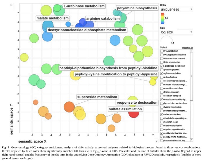 對差異表達的基因進行 GO 富集分析。在生物過程類別中,主要與超氧化物酶代謝,精氨酸分解代謝,蘋果酸代謝和多胺生物合成有關(guān)。分子功能類別中的富集類別為硫氧還蛋白活性,固醇結(jié)合,L-蘇氨酸氨裂解酶活性和富馬酰乙酰乙酸酶活性。在細胞成分類別中,主要為高爾基體堆積,小亞基加工體,細胞外間隙和 1,3-β-D-葡聚糖合酶復合體。