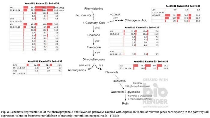 查爾酮合酶(CHS)是類黃酮生物合成中的關(guān)鍵酶。研究者發(fā)現(xiàn)兩個 CHS基因在三個煙草品種的葉片中均低表達,因為 CHS 主要在花中組成性表達,但其表達主要是由非生物/生物脅迫誘導的。注釋為 CHS-1B 或 CHS2 的Nitab4.5_0002920g0060.1 在’Katerini 53’和’Xanthi 81’中略有上調(diào),但第二個注釋為 III 型聚酮化合物合酶(NCBI:XP_016446648.1)差異很小。所有 CHI 基因也僅以低水平表達,在鑒定的結(jié)果中 F3H 也沒有差異。另一方面,鑒定了兩個參與黃酮醇形成的 FLS 基因。FLS1(Nitab4.5_0005357g0020.1)(NCBI:LOC107794305)的表達最高,而 NtFLS(Ni-tab4.5_0006276g0010.1)的表達低得多。這兩個基因在品種之間沒有差異表達。還檢測到有助于花色苷生物合成的基因,例如 DFR 和 ANS。DFR 中第一個僅適度表達,另外一個沒有差異。ANS(Nitab4.5_0003274g0110.1)幾乎未表達(圖 2)。蘆丁是一種黃酮醇糖苷,在花青素途徑生物合成,其中包括黃酮醇 3-O-葡萄糖基轉(zhuǎn)移酶和黃酮醇 3-O-葡萄糖苷胰島素轉(zhuǎn)移酶。結(jié)果表明低表達的 4 種黃酮醇 3-O-糖基轉(zhuǎn)移酶和 2種黃酮醇 3-O-糖苷胰島素轉(zhuǎn)移酶在“Smirrni 3B”和“Xanthi 81”比“Katerini 53”中表達更高、更多。
