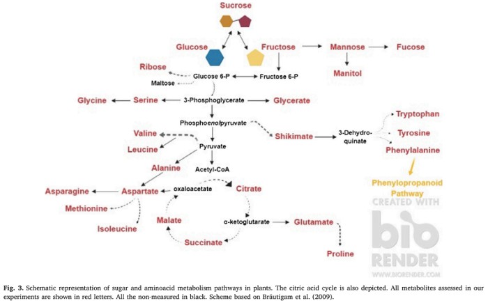 采集“Katerini 53”,“Xanthi 81”和“Smirrni 3B”葉片樣品,并使用氣相色譜GC-MS 和 LC-MS / MS 方法進行代謝分析?;蛐皖A先鑒定為不同的色譜模式,共有 78 種代謝化合物(包括糖,氨基酸,有機酸)差異積累,如圖 3 所示。詳細的非靶向 GC-MS 代謝組學分析用于鑒定煙葉中產(chǎn)生的大多數(shù)主要代謝產(chǎn)物。在本研究中,所測得的最豐富的可溶性糖是果糖,葡萄糖,半乳糖和蔗糖。在果糖和蔗糖中檢測到統(tǒng)計學差異;“Katerini 53”中的果糖含量更高,而“Smierni 3B”中的蔗糖含量更高?!癒aterini 53”與其它兩個品種相比葡萄糖和半乳糖水平較高,差異無統(tǒng)計學意義。在可溶性醇中,兩個豐富的代謝產(chǎn)物是山梨糖醇和肌醇,但在品種之間未檢測到統(tǒng)計學上的顯著差異。這三個品種中的蘋果酸含量沒有任何統(tǒng)計上顯著不同?!癤anthi 81”葉子的氨基酸含量最高,但谷氨酸和 γ-氨基丁酸(GABA)除外。GABA 和脯氨酸是煙葉中的主要氨基酸。與其他兩個品種相比,“Smirrni 3B”中的 GABA 水平明顯更高。’Smirrni 3B’和’Xanthi 81’中的脯氨酸水平較高,而“Katerini 53”的脯氨酸水平最低。在“Smirrni 3B”中檢測到了高濃度的甘氨酸和絲氨酸這兩種必需氨基酸。煙草生物堿在根部合成,然后轉(zhuǎn)運到葉片。生物堿、尼古丁與植物抗草食動物防御有關(guān)。在三個品種中檢測到的尼古丁濃度在統(tǒng)計學上有顯著差異。結(jié)果表明,“Xanthi 81”的尼古丁濃度最高,而“Smirrni 3B”的尼古丁濃度最低。與“Katerini 53”相比,“Xanthi 81”中腐胺的含量有所降低,但其濃度仍高于“Smirrni 3B”。鑒定了所有擬參與煙草中尼古丁生物合成的相應基因,但僅發(fā)現(xiàn)少數(shù)幾個在成熟葉片中表達。然而,基因 XS 和 QPT(三分之二)在“Xanthi 81”中表達較高。與其它兩個品種相比,這與“Xanthi 81”葉片中較高的尼古丁含量相關(guān),這表明它可能是遺傳控制的。