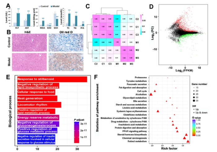 誘導(dǎo)小鼠發(fā)生NAFLD,結(jié)果顯示血清ALT、AST、TC、TG、FFA水平顯著升高;MDA、SOD和GSH水平的變化表明模型組小鼠肝臟的氧化應(yīng)激狀態(tài)(圖1A)。通過H&E染色和油紅O染色觀察模型組肝組織病理改變和脂質(zhì)堆積情況(圖1B)。