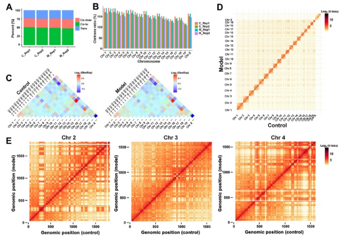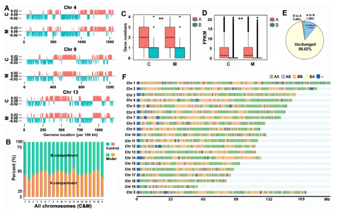 為了獲得三維染色質(zhì)構(gòu)象圖,作者對(duì)肝臟樣本的Hi-C文庫(kù)進(jìn)行了測(cè)序,每組總共獲得超過477 Gb的數(shù)據(jù)。在去除PCR重復(fù)位點(diǎn)后,每個(gè)樣本獲得了超過8.02億對(duì)有效Hi-C數(shù)據(jù),測(cè)序深度為68.56%和68.96%,能夠以10 kb分辨率檢查C組和M組的相互作用。順反式相互作用的比例顯示,約四分之三的相互作用發(fā)生在染色體內(nèi),四分之一的相互作用發(fā)生在染色體間質(zhì)(圖2A)。,這個(gè)頻率可以揭示染色體在基因組中的相互作用強(qiáng)度和染色體在細(xì)胞核中的相對(duì)位置。染色體之間的相互作用頻率熱圖如圖2C所示。通過熱圖顏色由對(duì)照組的藍(lán)色變?yōu)镹AFLD組的淺紅色,可以發(fā)現(xiàn)染色體Chr2與Chr5之間相互作用頻率的差異,提示NAFLD組兩染色體之間距離較近,相互作用較強(qiáng)。相比之下,觀察到的顏色從紅色變?yōu)樗{(lán)色,表明NAFLD組染色體之間的空間距離更遠(yuǎn),相互作用更弱,如Chr 7和Chr 11之間的相互作用。將各組的兩個(gè)Hi-C庫(kù)結(jié)合起來,進(jìn)行對(duì)照組與模型組的對(duì)比分析。根據(jù)任意兩個(gè)bin之間覆蓋的Hi-C讀對(duì)的歸一化相互作用信號(hào)強(qiáng)度,繪制全基因組相互作用矩陣(圖2D),染色體內(nèi)相互作用矩陣如圖所示。