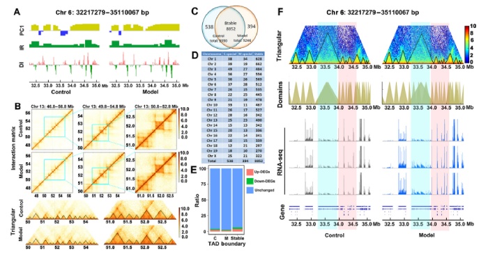 作者用TadLib軟件在20kb分辨率下識(shí)別TADs。在對(duì)照組和模型組TAD比較中,作者在對(duì)照組中發(fā)現(xiàn)了8179個(gè)TAD,在NAFLD組中發(fā)現(xiàn)了7818個(gè)TAD,其TAD大小中位數(shù)為180 kb。TAD結(jié)構(gòu)分析表明,TADs具有穩(wěn)定的染色質(zhì)結(jié)構(gòu)特征。方向性指數(shù)(DI)衡量了給定感興趣區(qū)域接觸方向的不平衡46,并與TAD邊界有關(guān),TAD邊界顯示出從上游到下游DI的強(qiáng)烈轉(zhuǎn)移特征(圖4A)。作者在對(duì)照組和NAFLD中分別識(shí)別出9390和9246個(gè)TAD邊界,其中538個(gè)為特殊控制邊界,394個(gè)為模型組邊界)。TADs在對(duì)照組和NAFLD組之間高度相關(guān),只有大約5%的TAD邊界在NAFLD發(fā)展過程中發(fā)生改變。TADs在基因表達(dá)調(diào)控中發(fā)揮重要作用,繪制了與差異TAD邊界相關(guān)的DEGs,并分析了它們的數(shù)量。圖4E所示為各組唯一TAD邊界及兩組不變邊界相關(guān)的deg。NAFLD的基因表達(dá)受到TAD邊界變化的影響,如圖4F中紅色陰影的染色體區(qū)域,以及圖4F中藍(lán)色陰影所示區(qū)域的交替。鑒定出42個(gè)上調(diào)基因和30個(gè)下調(diào)基因(支持信息圖S5和表S11)。這些結(jié)果表明,由于與NAFLD發(fā)展相關(guān)的新的TAD邊界的形成和消失,轉(zhuǎn)錄譜發(fā)生了改變。