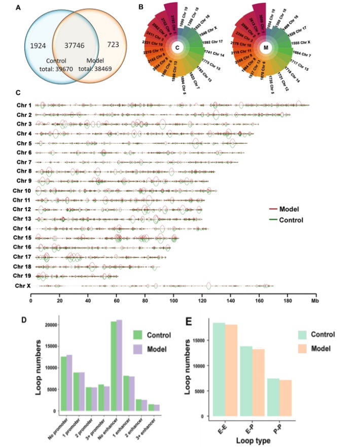 除了短程染色質(zhì)相互作用外,3D基因組組織中的遠(yuǎn)程環(huán)帶來了兩個(gè)線性分離的位點(diǎn)之間的物理接近。作者通過Hi-C接觸矩陣使用改進(jìn)的HICCUP方法注釋染色質(zhì)環(huán),分辨率為10 kb。結(jié)果顯示,與NAFLD發(fā)展相關(guān)的環(huán)的總數(shù)減少(從39,670到38,469,圖5A),而環(huán)的大小沒有變化(環(huán)的中位數(shù)長(zhǎng)度為70 kb,支持信息圖S6A。每條染色體的環(huán)分布如圖5B和C所示,Chr 1上的環(huán)分布*多,對(duì)照組和模型組分別有3193個(gè)和3099個(gè)環(huán)(圖5B)。
