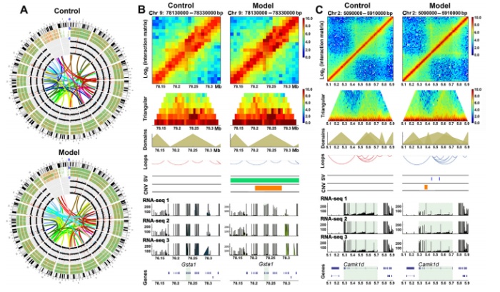 非酒精性脂肪性肝病(NAFLD)的3D基因組和基因組變異在很大程度上是未知的,盡管它們?cè)诩?xì)胞功能和生理過程中起著關(guān)鍵作用。在正常和NAFLD小鼠的肝臟上進(jìn)行高通量染色體構(gòu)象捕獲(Hi-C)、ONT測(cè)序和rna測(cè)序(RNA-seq)測(cè)定。生成高分辨率3D染色質(zhì)相互作用圖,通過Hi-C檢測(cè)不同的3D基因組層次結(jié)構(gòu),包括A/B區(qū)室、拓?fù)湎嚓P(guān)結(jié)構(gòu)域(TADs)和染色質(zhì)環(huán),并檢測(cè)結(jié)構(gòu)變異(SVs)和拷貝數(shù)變異(CNVs)的全基因組測(cè)序。在正常和NAFLD小鼠間,發(fā)現(xiàn)了基因組中數(shù)千個(gè)區(qū)域在3D染色質(zhì)組織和基因組重排方面的變化,并揭示了基因調(diào)節(jié)異常經(jīng)常伴隨這些變化。在NAFLD中發(fā)現(xiàn)了候選靶基因,受基因重排和空間組織破壞的影響。作者的數(shù)據(jù)為NAFLD研究提供了高分辨率的三維基因組相互作用資源,揭示了遺傳重排、空間組織破壞和基因調(diào)控之間的關(guān)系,并確定了與NAFLD發(fā)病機(jī)制中這些變異相關(guān)的候選基因。這些新發(fā)現(xiàn)為NAFLD的發(fā)病機(jī)制提供了新的見解,并為NAFLD的治療提供了新的概念框架。