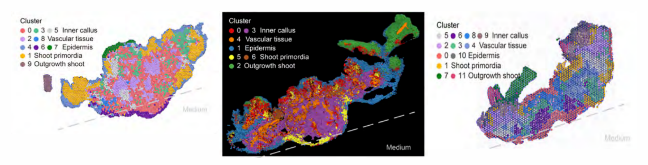 番茄是一種全球重要的經(jīng)濟(jì)作物,但在其愈傷組織中芽再生的分子機(jī)制仍有很多未知。為了深入研究番茄愈傷組織中芽再生的細(xì)胞發(fā)育和分子機(jī)制,研究團(tuán)隊通過協(xié)作開發(fā)和掌握多種空間轉(zhuǎn)錄組實驗和分析技術(shù),建立了番茄愈傷組織芽再生的空間轉(zhuǎn)錄組圖譜。研究結(jié)果揭示了愈傷組織中存在高度異質(zhì)的細(xì)胞群,將番茄愈傷組織分為了表皮、維管組織、芽原基、成熟芽和內(nèi)部愈傷組織五種細(xì)胞類型。在表皮細(xì)胞中,研究發(fā)現(xiàn)了兩種主要的細(xì)胞亞型,它們分布在靠近空氣和培養(yǎng)基的不同位置,并具有不同的功能。
