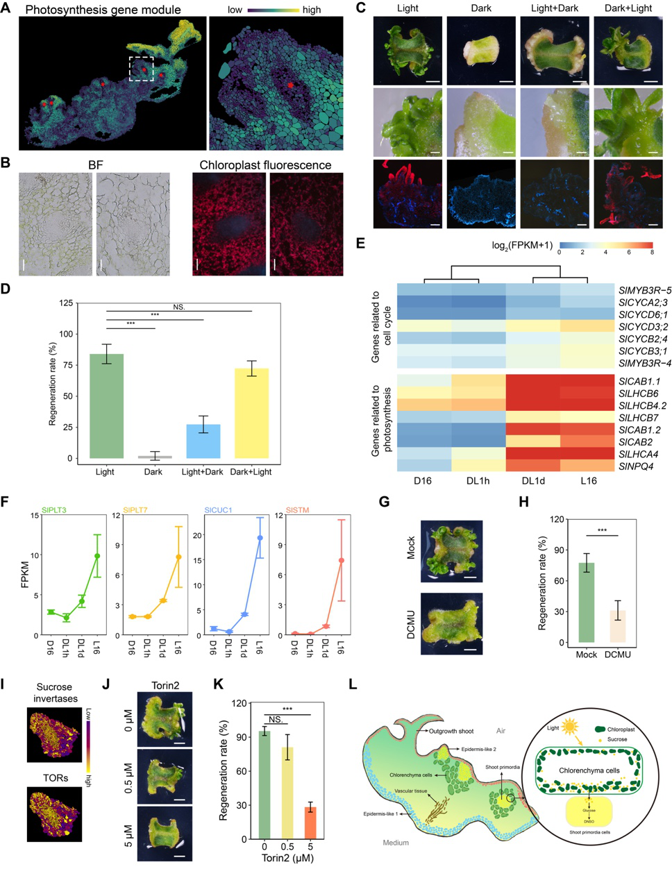 空間轉(zhuǎn)錄組技術(shù)優(yōu)勢在于揭示不同細(xì)胞位置關(guān)系。研究團(tuán)隊發(fā)現(xiàn)番茄愈傷組織的芽原基被表達(dá)光合基因的細(xì)胞包圍,相鄰細(xì)胞含葉綠體,稱為綠色組織(chlorenchyma)細(xì)胞。黑暗后見光處理影響芽原基分化,光誘導(dǎo)綠色組織細(xì)胞對芽再生十分關(guān)鍵。光形態(tài)建成相關(guān)基因在芽原基和綠色細(xì)胞中卻無特定表達(dá)模式。光合抑制劑DCMU減慢芽再生速率,證明綠色細(xì)胞光合必要性。蔗糖可通過TOR信號調(diào)控芽原基發(fā)育,相關(guān)基因在芽原基位置高表達(dá),綠色組織細(xì)胞蔗糖可傳輸至芽原基并激活TOR,促進(jìn)芽的分化發(fā)育。