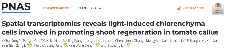 近日,北京大學(xué)現(xiàn)代農(nóng)業(yè)研究院的李博生研究員團(tuán)隊與鄧興旺院士團(tuán)隊在國際學(xué)術(shù)期刊PNAS上發(fā)表了題為“Spatial transcriptomics reveals light-induced chlorenchyma cells involved in promoting shoot regeneration in tomato callus”的研究論文,建立了植物愈傷組織芽再生的空間轉(zhuǎn)錄組圖譜。