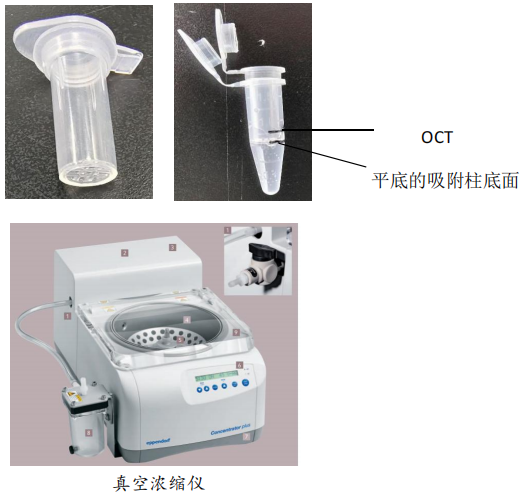 3)冰上預(yù)冷75% OCT包埋劑溶液(5mlOCT+2.5ml滅菌水顛倒混勻),1.5ml離心管中加入1ml 75%OCT,將植物組織浸潤(rùn)在其中,將平底的無(wú)吸附膜的吸附柱放入1.5ml離心管中,以防止抽真空過(guò)程組織上浮在OCT表面,打開所有管蓋,置于真空濃縮儀中(注意配平)。室溫抽真空10min,摸索設(shè)置成V-AQ,促進(jìn)OCT溶液充分包裹和進(jìn)入組織空隙中,保證OCT填充包埋組織的完整性。如下圖:
