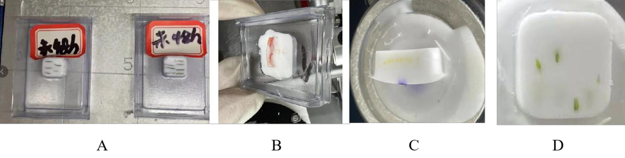 - 培養(yǎng)基培養(yǎng)樣本:在無(wú)菌超凈臺(tái)中取出組織,去除組織表面附著的培養(yǎng)基,用超純水將組織表面清洗干凈。從活體植株上取下新鮮目標(biāo)區(qū)域組織置于培養(yǎng)皿中,利用4℃預(yù)冷的鑷子和剪刀將目標(biāo)區(qū)域外的組織結(jié)構(gòu)盡量去除,若組織內(nèi)部存在空腔盡可能修剪組織暴露空腔,之后將組織裁剪成<5*6.5mm(10x Genomics)/6.8*6.8mm(百創(chuàng)S3000)的小塊;
