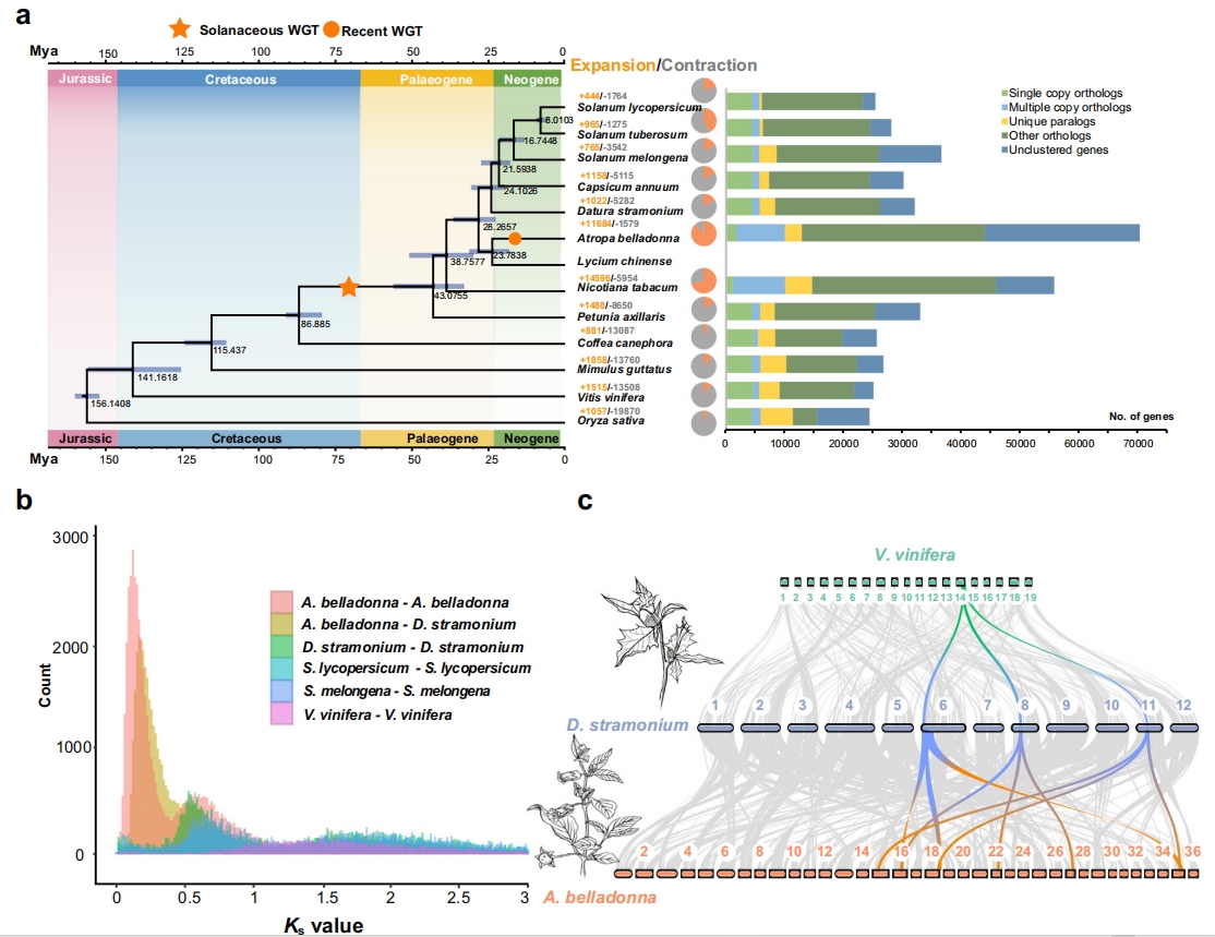 作者利用顛茄和曼陀羅,以及8個(gè)茄科物種和4種其他被子植物的207個(gè)單拷貝基因進(jìn)行系統(tǒng)發(fā)育分析。結(jié)果表明:顛茄和枸杞屬于一個(gè)分支,而曼陀羅、辣椒、茄子、番茄和馬鈴薯屬于另一個(gè)分支,估計(jì)矮牽牛在約43Mya(33-56Mya)從茄科物種分化而來(lái),曼陀羅在約28Mya(23-37Mya)由順茄和枸杞組成的分支分化而來(lái),而顛茄在大約24Mya(18-31Mya)從枸杞分化而來(lái)。Ks分析顯示,茄科物種與其他高等雙子葉植物共享較古老的伽馬古多倍體事件。對(duì)顛茄、曼陀羅和葡萄進(jìn)行基因組共線(xiàn)性分析,對(duì)于葡萄基因組的各個(gè)區(qū)域,通常在曼陀羅基因組中能鑒定出3個(gè)與之匹配的區(qū)域,并且在顛茄和曼陀羅之間也有相似的現(xiàn)象。