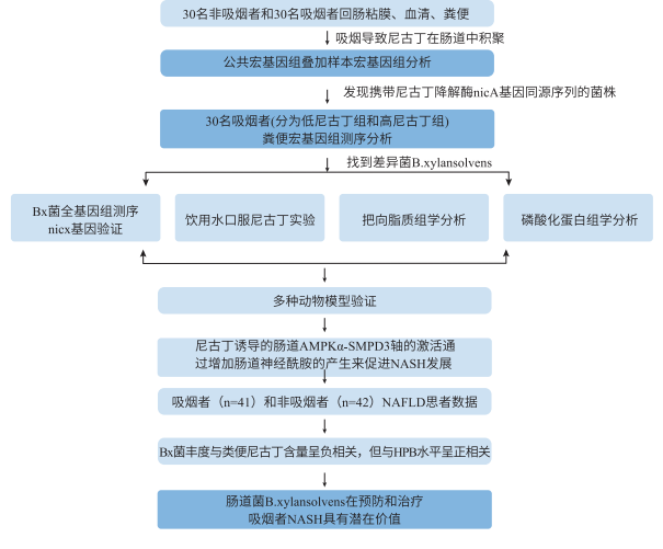 吸煙是人類(lèi)最常見(jiàn)的不健康行為之一,世界衛(wèi)生組織將吸煙列為可預(yù)防死亡的主要原因。戒煙是延長(zhǎng)預(yù)期壽命的最有效方法,但由于尼古丁的強(qiáng)大成癮性和戒斷癥狀,戒煙并不容易實(shí)現(xiàn)。尼古丁降解最近被認(rèn)為是阻斷尼古丁誘發(fā)的病理的一種策略。NAFLD(非酒精性脂肪肝病)包含廣泛的病理,通常從簡(jiǎn)單的脂肪變性發(fā)展為NASH(非酒精性脂肪性肝炎),然后在某些情況下發(fā)展為肝硬化和肝癌。由于腸道產(chǎn)生的代謝物在通過(guò)腸-肝軸的NAFLD進(jìn)展中具有關(guān)鍵作用,因此建立腸道尼古丁積累、腸源性代謝物和NAFLD進(jìn)展之間的關(guān)系可以為吸煙相關(guān)的肝臟疾病提供新的線索。
