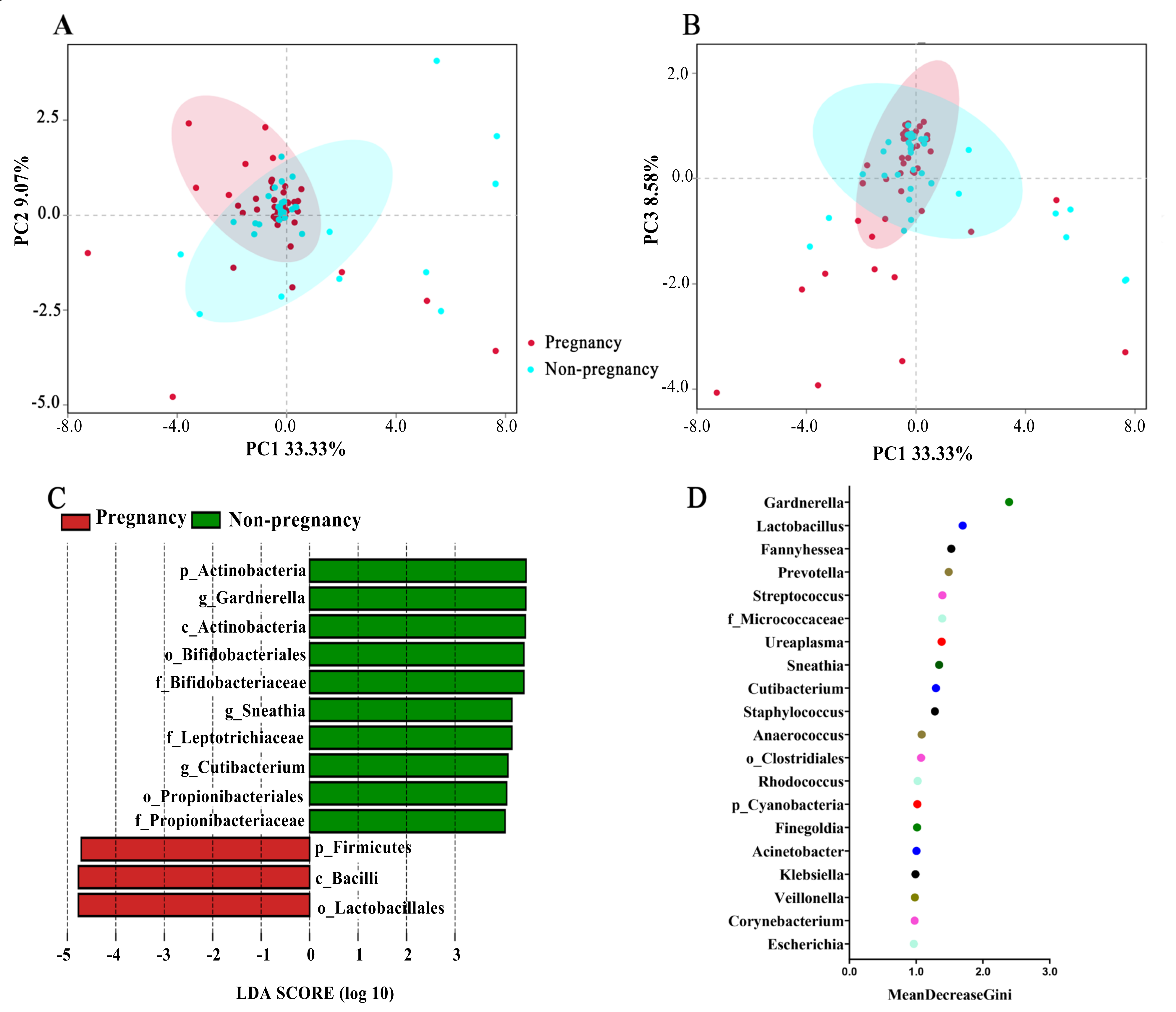 對(duì)陰道拭子進(jìn)行微生物多樣性測(cè)序分析。結(jié)果表明,在屬水平上,豐度最高的最常見(jiàn)細(xì)菌是Lactobacilli、Gardnerella(8.57%)、Streptococcus?(1.79%)和Atopobium(1.54%)。PCoA顯示這兩組的陰道微生物群落結(jié)構(gòu)略有不同;Lefse分析表明,妊娠組乳乳酸桿菌(Lactobacillus)豐度高于非妊娠組。非妊娠組中放線(xiàn)菌門(mén)和加德納菌屬的豐度高于妊娠組。在屬水平上,潛在生物標(biāo)志物包括?Gardnerella、Lactobacil-lus和Fannyhessea,(圖2D)。妊娠組加德納菌的相對(duì)豐度顯著低于未妊娠組。
