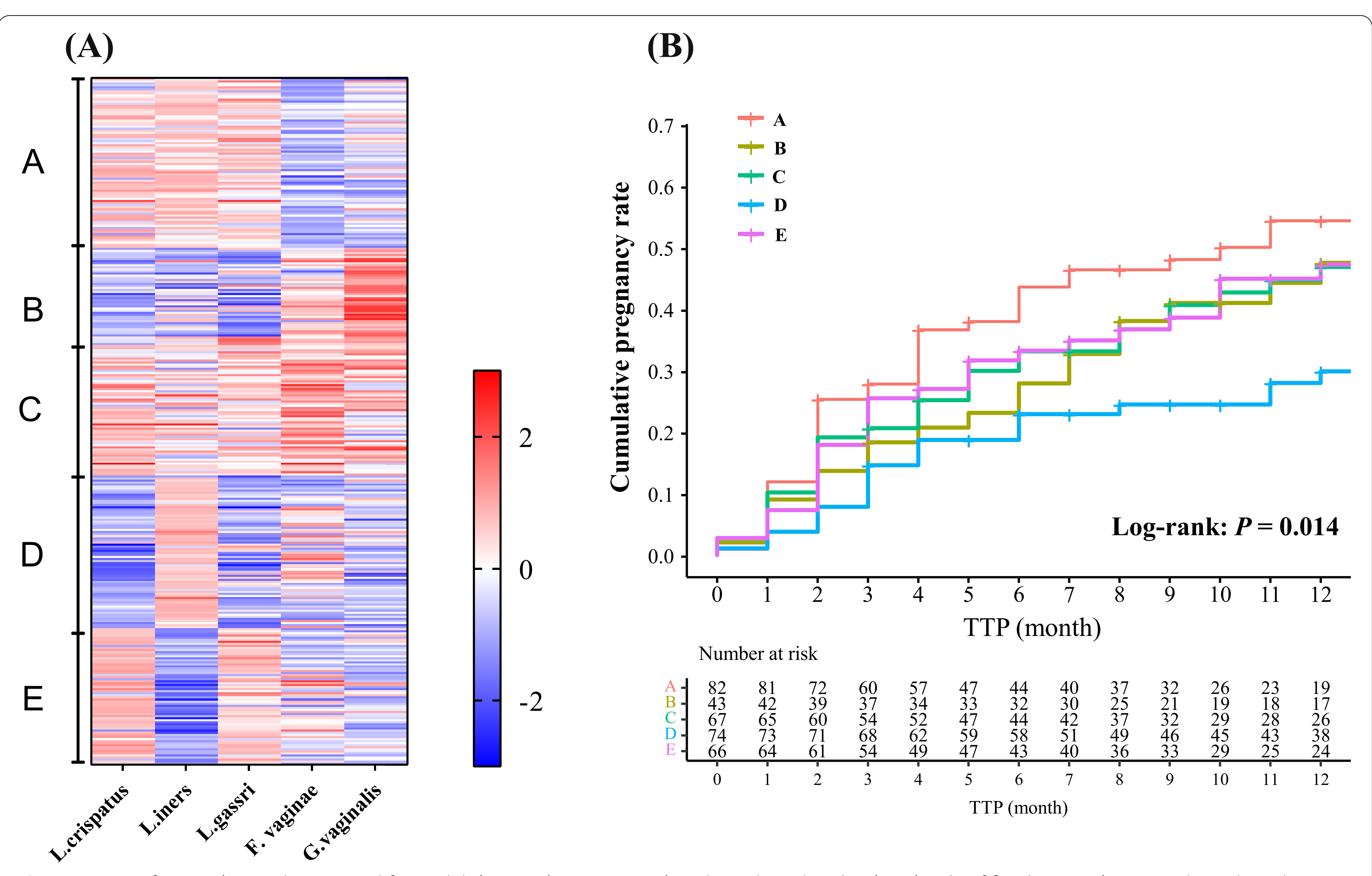 根據(jù)五種細(xì)菌的絕對(duì)負(fù)荷量,發(fā)現(xiàn)陰道微生物群聚為五種類(lèi)型(A-E)。圖4A顯示A型(24.7%,82/332)以三種高豐度乳桿菌和低豐度的G.vaginalis和F.vaginae為特征。B型(13.0%,43/332)表現(xiàn)為G.vaginalis高豐度,三種乳桿菌豐度低。C型(20.2%,67/332)以高豐度F.vaginae為主和適度豐富的三種乳桿菌。D型(22.3%,74/332)的特征是Liners豐度較高,其余4種豐度較低。E型(19.9%,66/332)表現(xiàn)為L(zhǎng). crispatus和L.gasseri豐度較高,其他三種豐度較低。圖4B顯示,具有不同類(lèi)型陰道微生物群的婦女具有不同的生育能力。A型陰道微生物組的累積妊娠率最高,而D型陰道微生物組的累積妊娠率最低。B型、C型和E型的累積妊娠率相似。