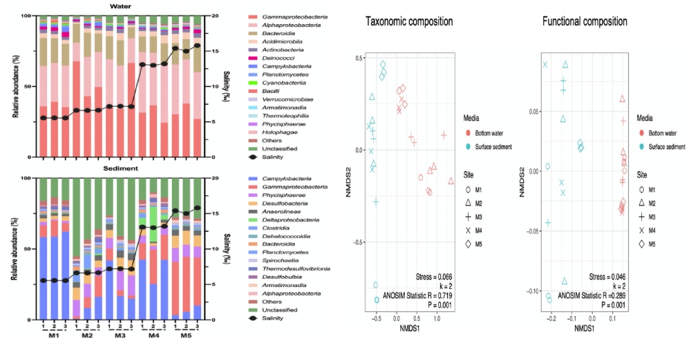 - 由于SWI對(duì)沉積細(xì)菌群落有主要影響,對(duì)M1(低鹽度)和M5(高鹽度)進(jìn)行了宏基因組測序。通過NMDS分析,沉積物細(xì)菌群落的病灶組成清晰分離;