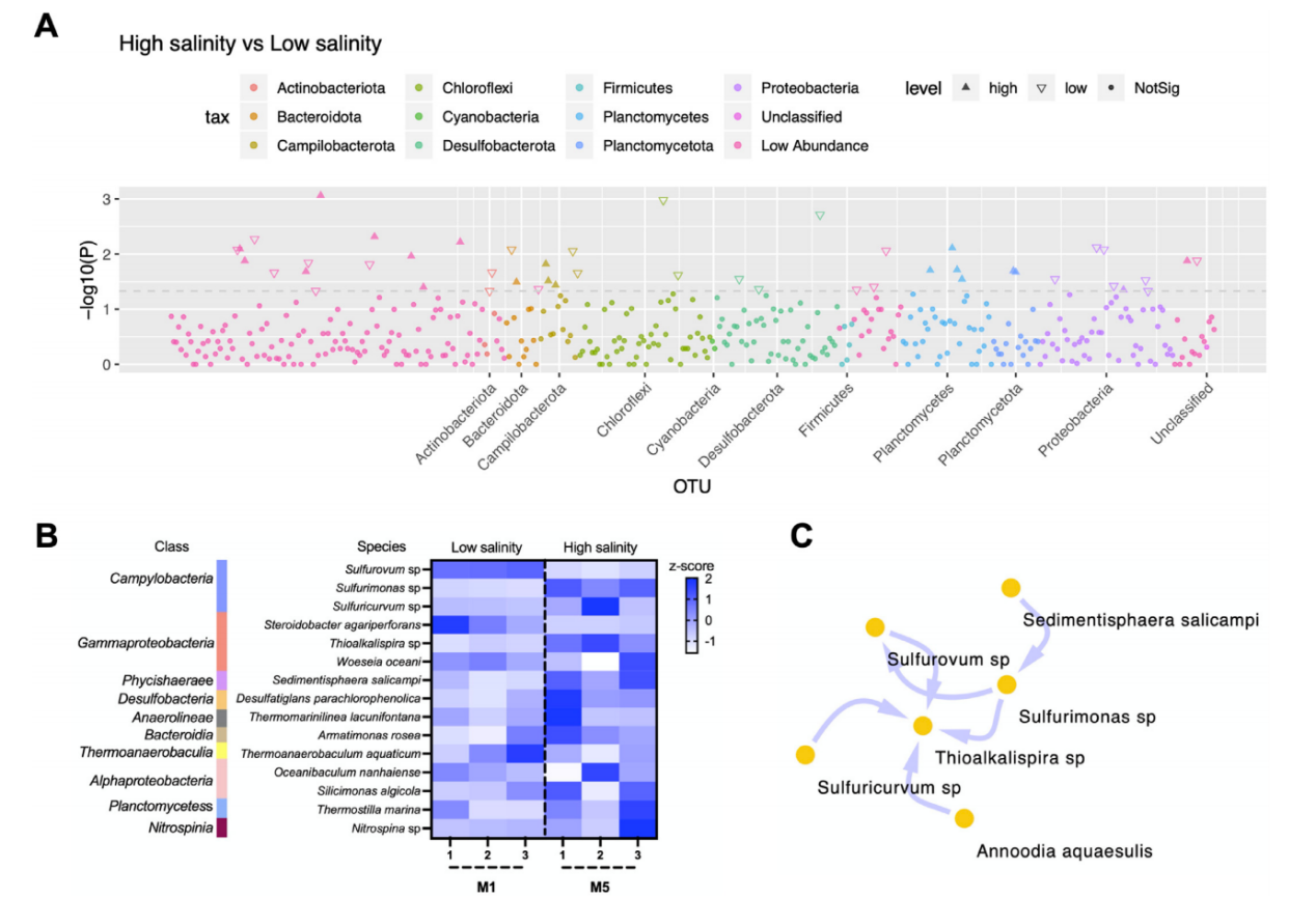 - 除低豐度細(xì)菌類群和未分類類群外,OTUs在低鹽度下富集的細(xì)菌門,包括放線菌門、氯化菌門、脫硫菌門、厚壁菌門和變形菌門,而高鹽度的群落包括彎曲菌和普朗菌;