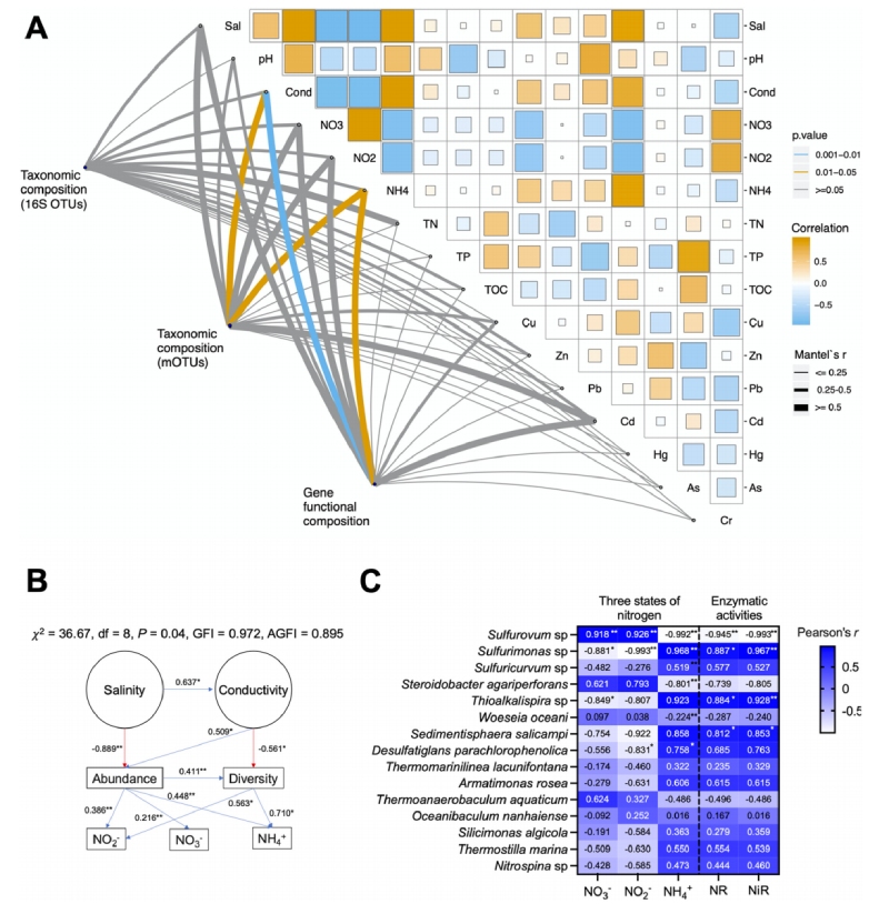 - Pearson相關(guān)分析顯示,優(yōu)勢(shì)細(xì)菌分類群Sulfurovum sp.和sulphimonas sp.與氮形態(tài)(NO2?、NO3?和NH4+)和酶活性(NR和NiR)顯著相關(guān)(P < 0.05);