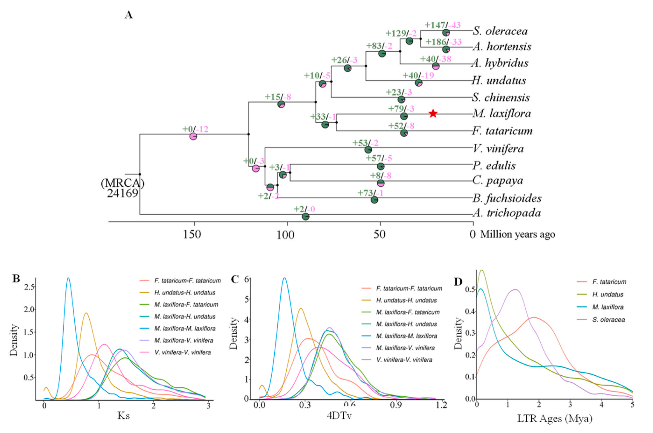 比較基因組研究發(fā)現(xiàn)疏花水柏枝與苦蕎(F. tataricum)的親緣關(guān)系最為密切,大約在65-81百萬(wàn)年前(Mya)發(fā)生分化;在19.74 ~ 24.60 Mya之間發(fā)生了一次全基因組復(fù)制(WGD), 4dTV分析證實(shí)了這一點(diǎn)。在0.15 Mya左右存在一個(gè)長(zhǎng)末端重復(fù)(LTR)插入。這些基因組變化可能與疏花水柏枝在進(jìn)化過(guò)程中所經(jīng)歷的環(huán)境劇變(如青藏高原隆升)有關(guān)?;蚣易宸治鲲@示疏花水柏枝的特有基因家族與能量代謝和信號(hào)轉(zhuǎn)導(dǎo)密切相關(guān);85個(gè)基因在疏花水柏枝基因組中經(jīng)歷了正選擇,這些基因在與氨基酸合成和代謝相關(guān)的KEGG通路中顯著富集。