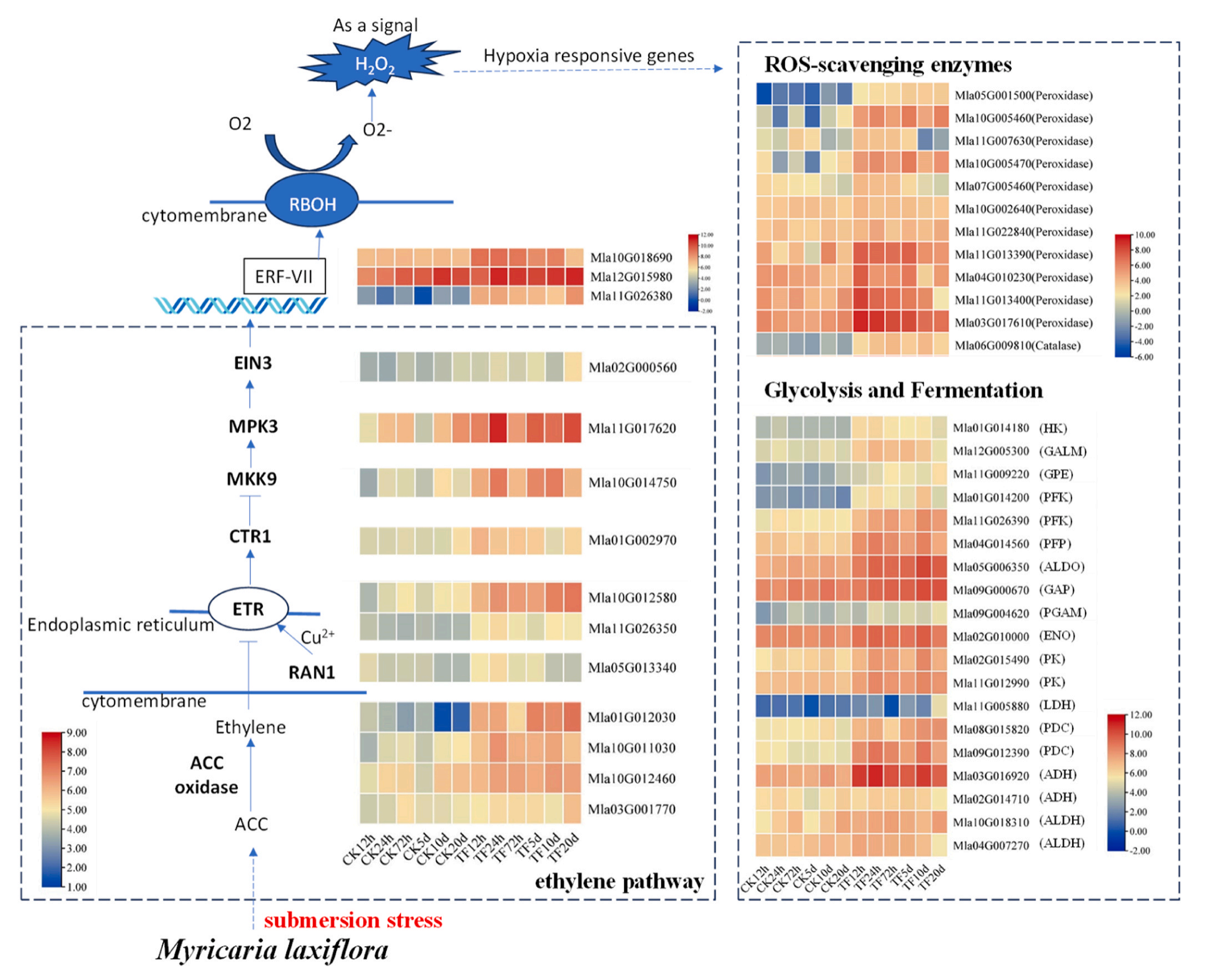 作者通過(guò)比較水淹和對(duì)照條件下疏花水柏枝形態(tài)、生理和轉(zhuǎn)錄組學(xué)的變化,分析了植物對(duì)水淹的適應(yīng)機(jī)制。總體而言,在完全淹沒(méi)的狀態(tài)下,疏花水柏枝采用“靜止”的策略。具體來(lái)說(shuō),在淹水條件下,光合作用減弱,生長(zhǎng)停滯,糖酵解被激活,抗氧化酶系統(tǒng)增強(qiáng)。乙烯反應(yīng)途徑可能是這一過(guò)程的調(diào)控因子,MlERF-VII基因(Mla11G026380)可能是調(diào)控這一過(guò)程的關(guān)鍵基因。