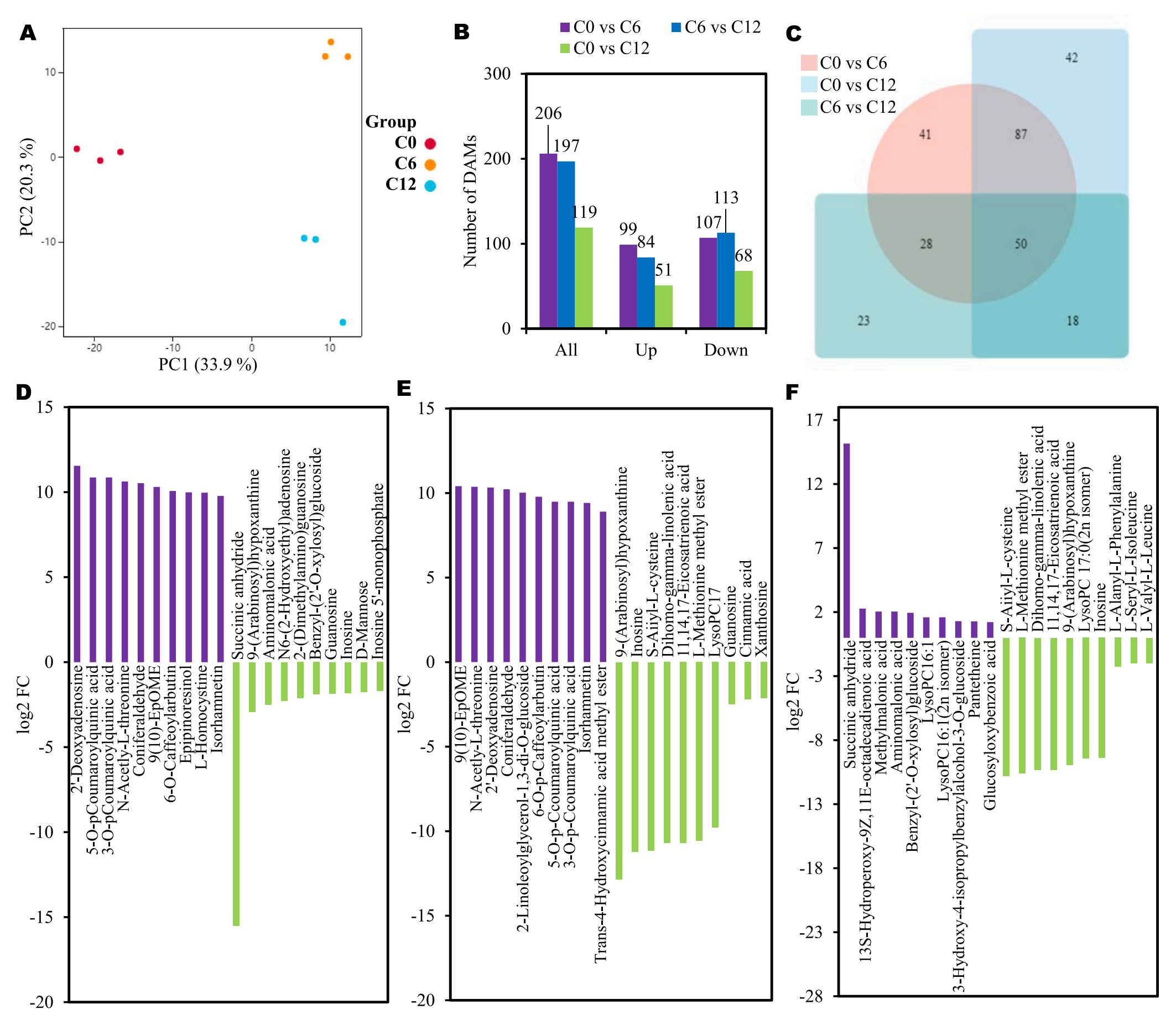 韋恩圖分析評估每個差異分組特有和共有的DAMs (圖2C)。圖2D-F展示了每個比較組中豐度增加和減少的top20的DAMs。C6組中10個代謝物豐度升高,如2′-脫氧腺苷、3-O-對香豆酰奎寧酸、n -乙酰- l -蘇氨酸、松柏醛、9(10)-EpOME、6-O-咖啡酰丁醇、表肌醇、l -同型半胱氨酸、5-O-對香豆酰奎寧酸、異鼠李素。相反,琥珀酸酐、9-(阿拉伯糖基)次黃嘌呤、氨基丙酸、N6-(2-羥乙基)腺苷、2-(二甲氨基)鳥苷、芐基-(2 ‘-O-木糖基)葡萄糖苷、鳥苷、肌苷、D-甘露糖和肌苷5 ‘ -單磷酸在C6組中的豐度較低(圖2D)。