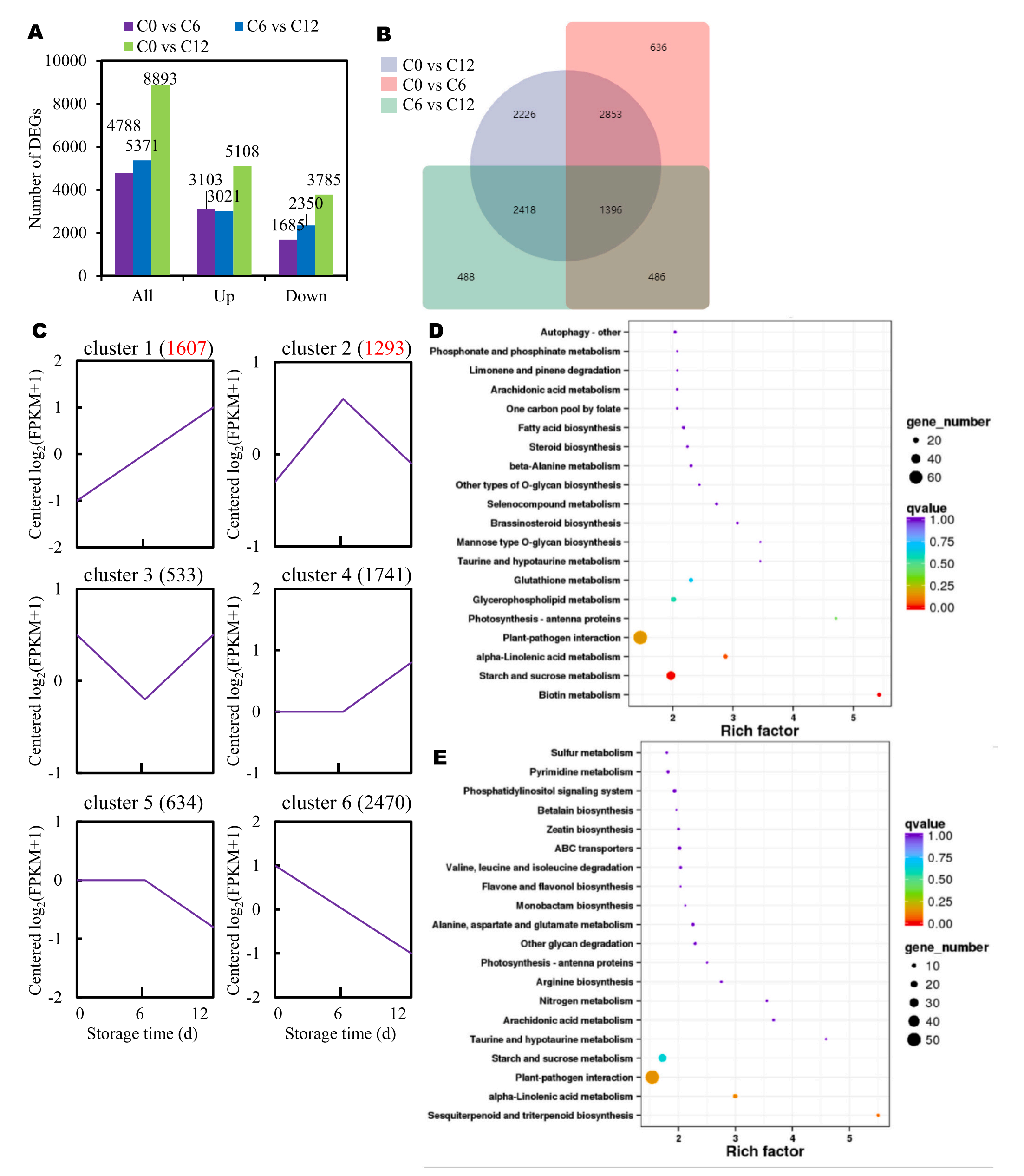為了更好地了解基因表達(dá)的變化,該研究進(jìn)行比較轉(zhuǎn)錄組分析。結(jié)果顯示許多基因在芋褐變過程中表現(xiàn)出不同的表達(dá)譜。具體來說,在C0和C6的比較中,鑒定出3103個表達(dá)上調(diào)的基因和1685個表達(dá)下調(diào)的基因。同樣,在C6和C12組的比較中,發(fā)現(xiàn)3021個DEGs上調(diào),2350個DEGs下調(diào)。此外,與C0組相比,C12組有5108個基因的表達(dá)量更高(圖4A)。在褐變過程中發(fā)現(xiàn)了更多的上調(diào)基因,表明芋頭的基因表達(dá)發(fā)生顯著的變化。有趣的是,當(dāng)比較C0與C6、C6與C12、C0與C12之間的DEGs時,發(fā)現(xiàn)1396個DEGs重疊(圖4B)。