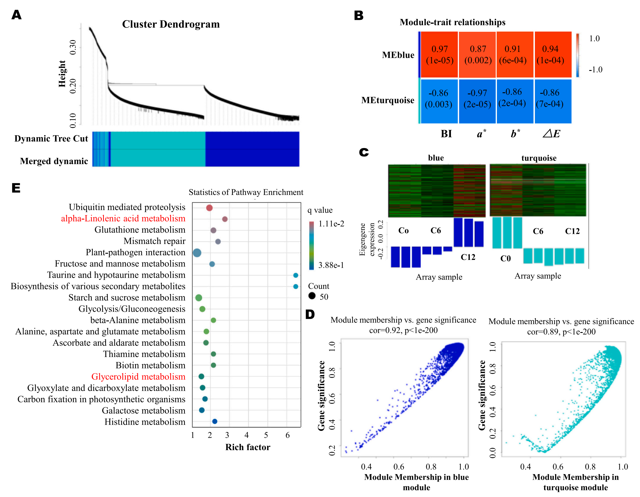 為了進(jìn)一步研究脂質(zhì)代謝與冷藏芋頭切片褐變之間的關(guān)系,研究采用WGCNA分析進(jìn)行研究。如圖5A所示,鑒定出兩個與切片芋頭在冷藏期間褐變發(fā)育顯著相關(guān)的模塊。藍(lán)色模塊中基因與褐變BI、a*、b*、△E 4項指標(biāo)呈正相關(guān),而綠松石模塊中基因與褐變指標(biāo)呈負(fù)相關(guān)(圖5B)。此外,隨著褐變的發(fā)展,藍(lán)色模塊中基因的表達(dá)量逐漸增加,而綠松石模塊中基因的表達(dá)量逐漸減少(圖5C)。此外,藍(lán)色和綠松石模塊中每個基因與褐變的相關(guān)性都很高(圖5D),說明這兩個模塊的基因與冷藏芋頭片的褐變發(fā)育高度相關(guān)。