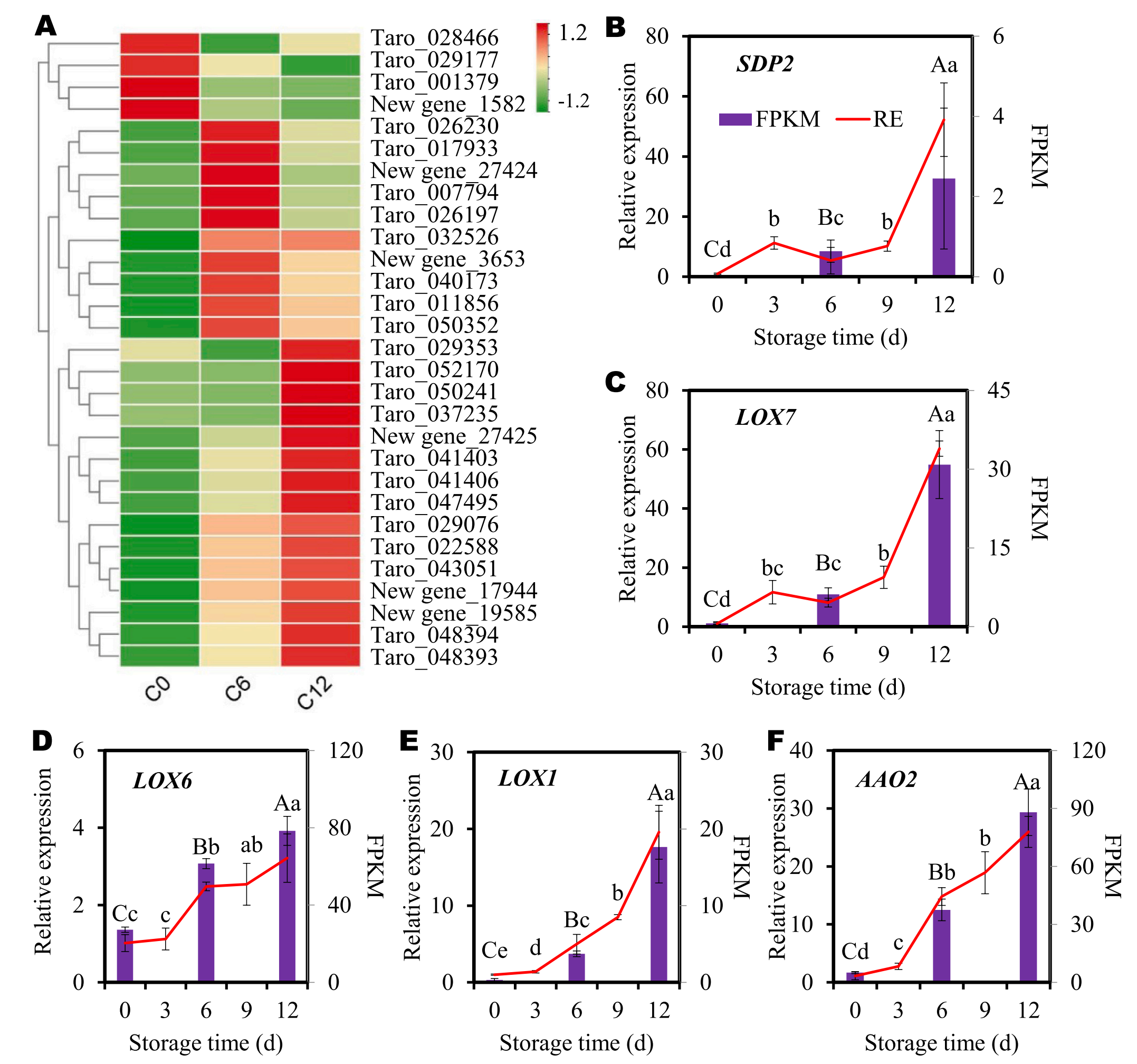 為了驗證RNA-seq數(shù)據(jù)的質(zhì)量,研究檢測了亞麻酸代謝途徑中DEGs的表達(dá)模式。在切片芋頭褐變過程中,該途徑中的DEGs差異表達(dá)(圖6A)。在這些基因中,4個基因(taro_028466、029177、001379和new gene_1582)的表達(dá)量在第6天較0天下降(圖6A)。10個基因(taro_026230、017933、007794、026197、032526、040173、011856、050352以及new gene_27424和3563)的表達(dá)量在第6天出現(xiàn)了增加,隨后又出現(xiàn)了下降。然而,這些基因在第12天的表達(dá)水平仍然高于第0天(圖6A)。其余15個基因在褐變過程中表現(xiàn)出穩(wěn)定的表達(dá)增加。這些結(jié)果再次證實了亞麻酸代謝參與了芋頭褐變過程。