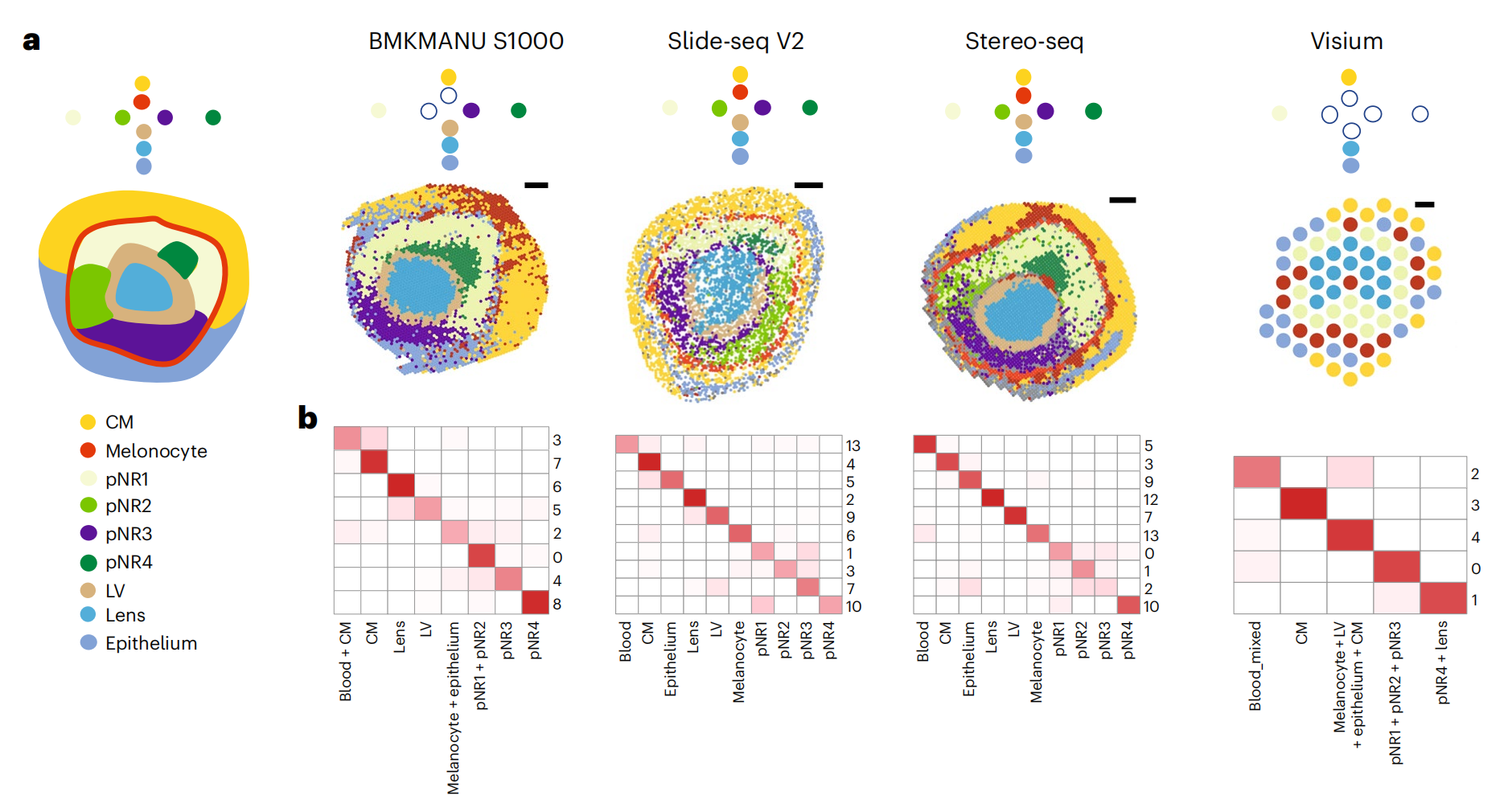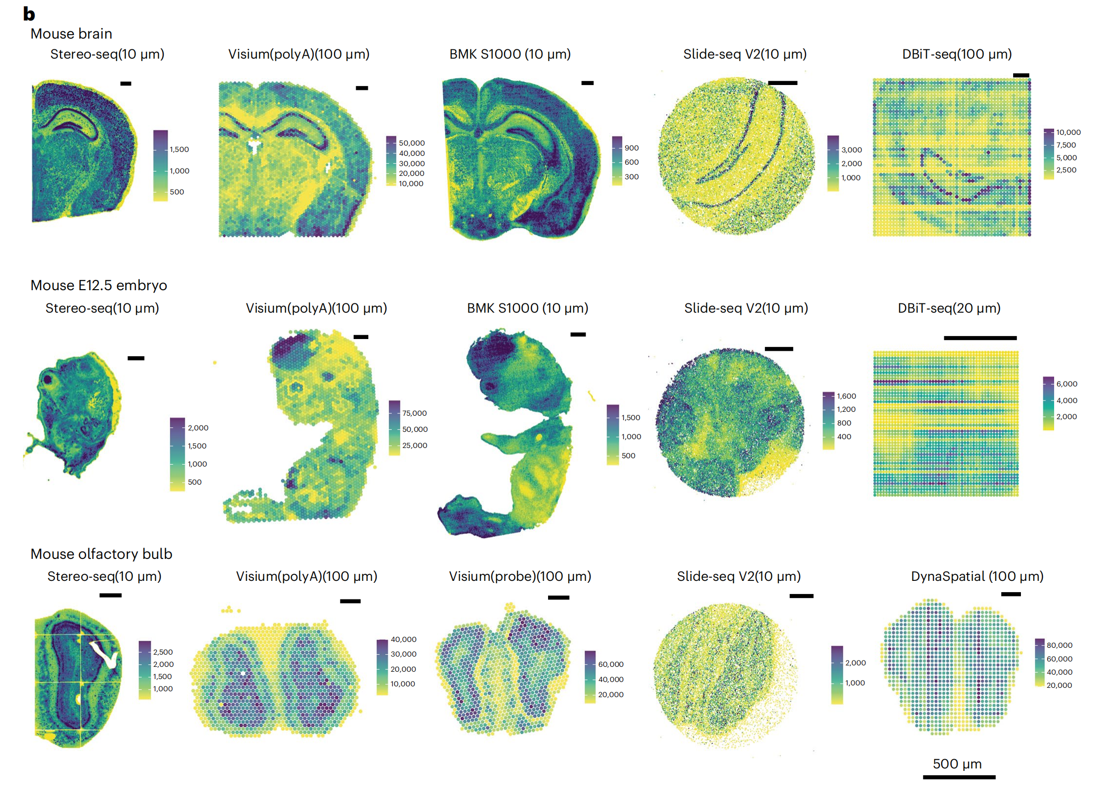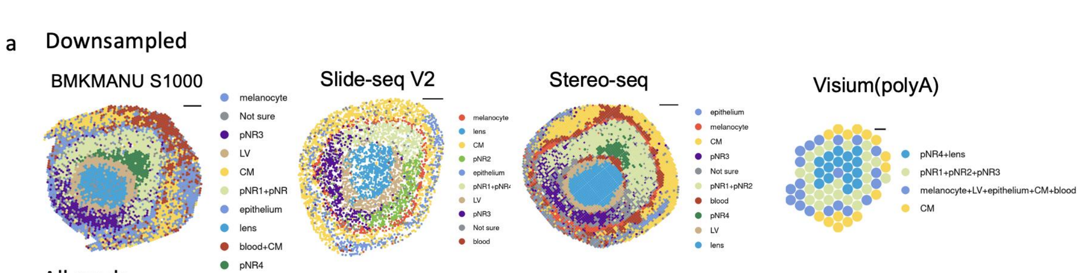 使用11種sST技術(shù),對三種組織進行實驗,測序及分析,并對可以實現(xiàn)更高分辨率的BMKMANU S1000、Stereo-seq及Slide-seqV2?在細胞級(10μm)分辨率下進一步進行了分析。