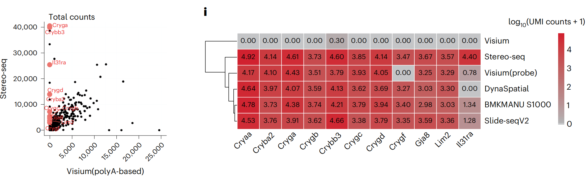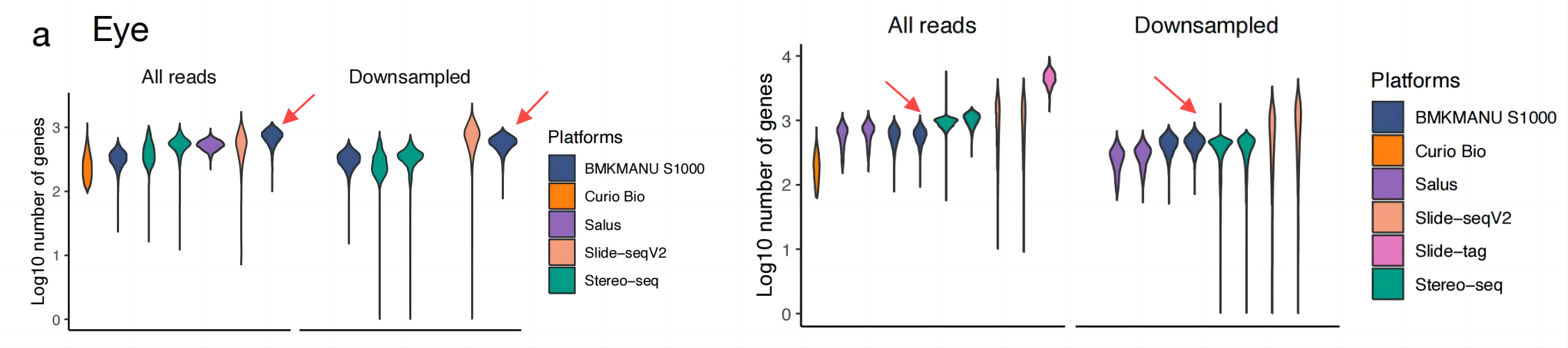 在各個平臺的捕獲性能測試中,文章通過對相同捕獲面積內(nèi)的UMI數(shù)進行統(tǒng)計,以此來進行捕獲效率的評判,文中分別對原始測序下,以及數(shù)據(jù)歸一化條件下,進行了統(tǒng)計,展示出了較大的差異,這意味著不同的測序量對UMI的檢出存在較大的影響,高的數(shù)據(jù)量可以明顯提升UMI的檢出,隱性表示空間組學(xué)應(yīng)需要比單細胞更高的測序深度。
