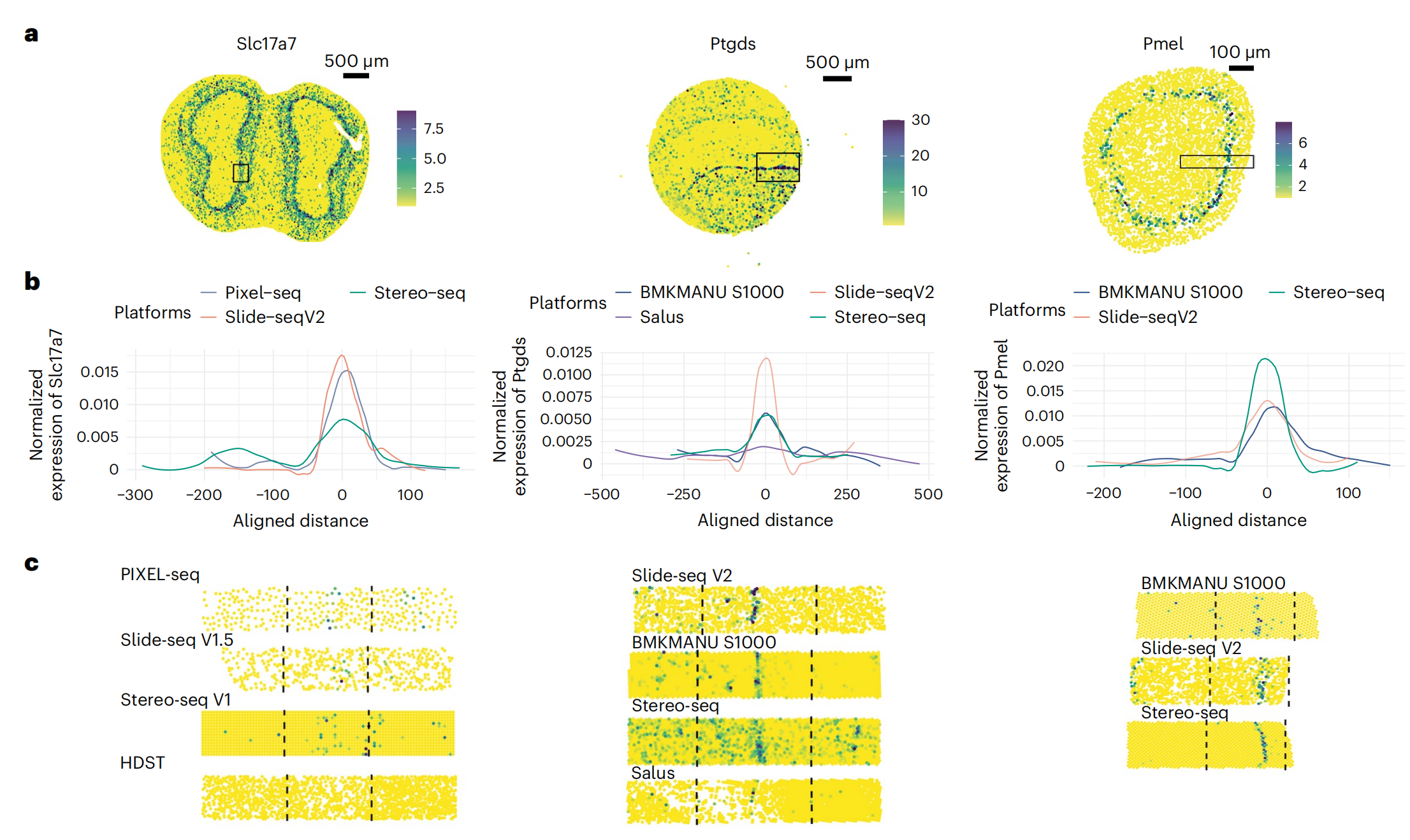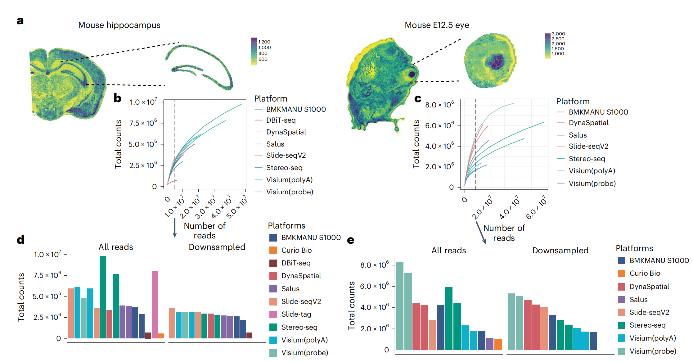 通過小鼠嗅球(Pixel-seq,Stereo-seq,Slide-seqV2),小鼠腦海馬(BMKMANU S1000,Slide-seqV2,Salus,Stereo-seq),小鼠胚胎眼球(BMKMANU S1000,Stero-seq,Slide-seqV2)經(jīng)典marker(Slc17a7、Ptgds及Pmel)的回溯來評估分子的橫向逸散問題,發(fā)現(xiàn)BMKMANU?S1000在腦海馬的表現(xiàn)優(yōu)秀,在小鼠胚胎眼球中表現(xiàn)不足,不同的技術(shù)表現(xiàn)出的差異,文中也給出了推論:可能跟樣本切片操作及組織透化等實驗存在關(guān)聯(lián),提示后續(xù)的研究者在樣本準(zhǔn)備及透化實驗應(yīng)該更加的謹慎。