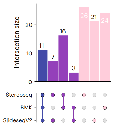 文中對visium(polyA-based)未能捕獲到的基因,在其它技術(shù)平臺中的表現(xiàn)也做了統(tǒng)計,其中BMKMANU S1000、Stereo-seq及Slide-seqV2都展現(xiàn)出了統(tǒng)一且全面的基因捕獲性能。