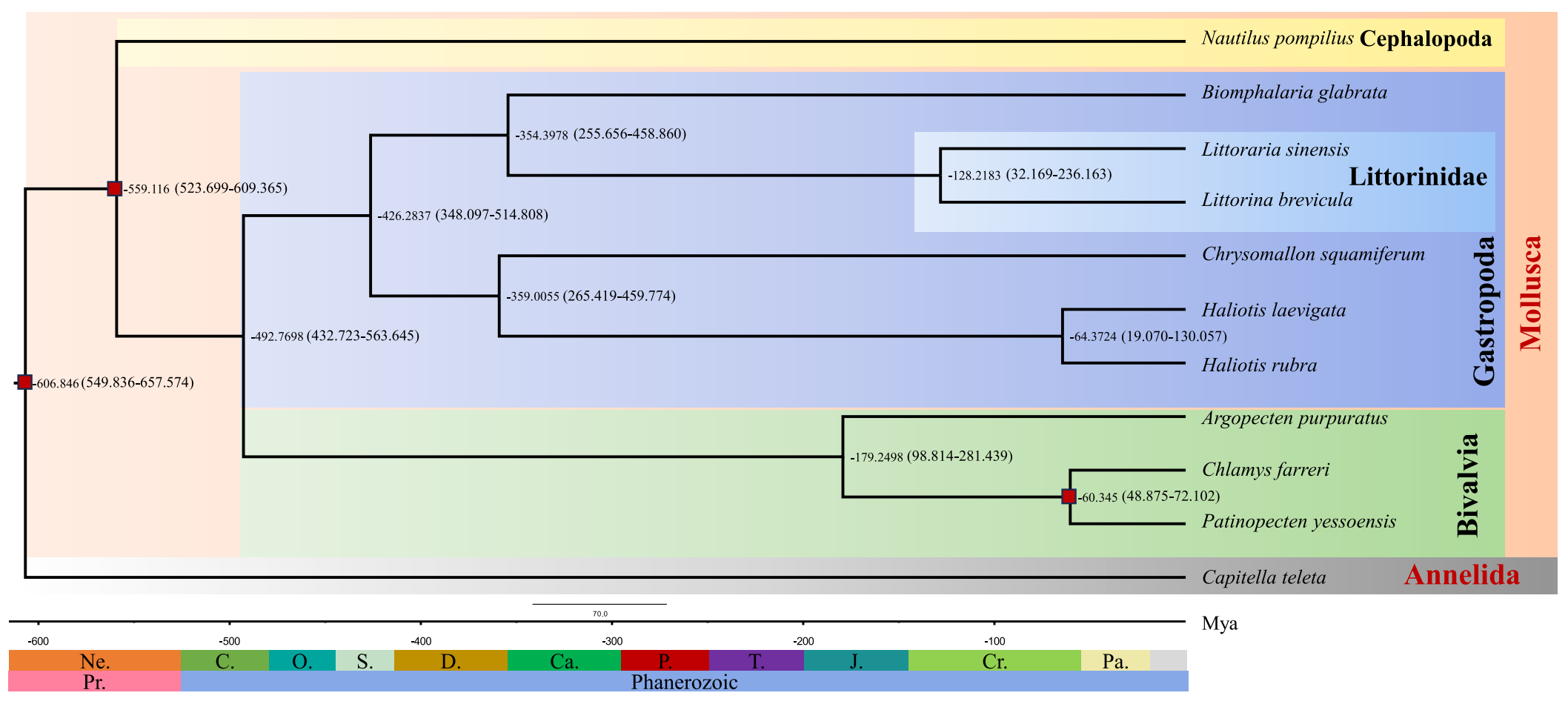 通過比較基因組學分析構建了包括兩種濱螺在內的11個物種的系統(tǒng)發(fā)育樹,并估算兩種濱螺的分化時間大約在128.22Mya前。進一步的研究結果表明與刺激反應、代謝過程、先天免疫和抗氧化反應相關的基因或基因家族可能在濱螺應對潮間帶多種環(huán)境因子脅迫的過程中發(fā)揮著重要作用,受損核酸和蛋白的修復或降解可能是濱螺在多重壓力下抵抗細胞凋亡、維持細胞內穩(wěn)態(tài)的主要方式。相關研究結果為潮間帶無脊椎動物適應性進化分子機制的后續(xù)研究提供了基礎。