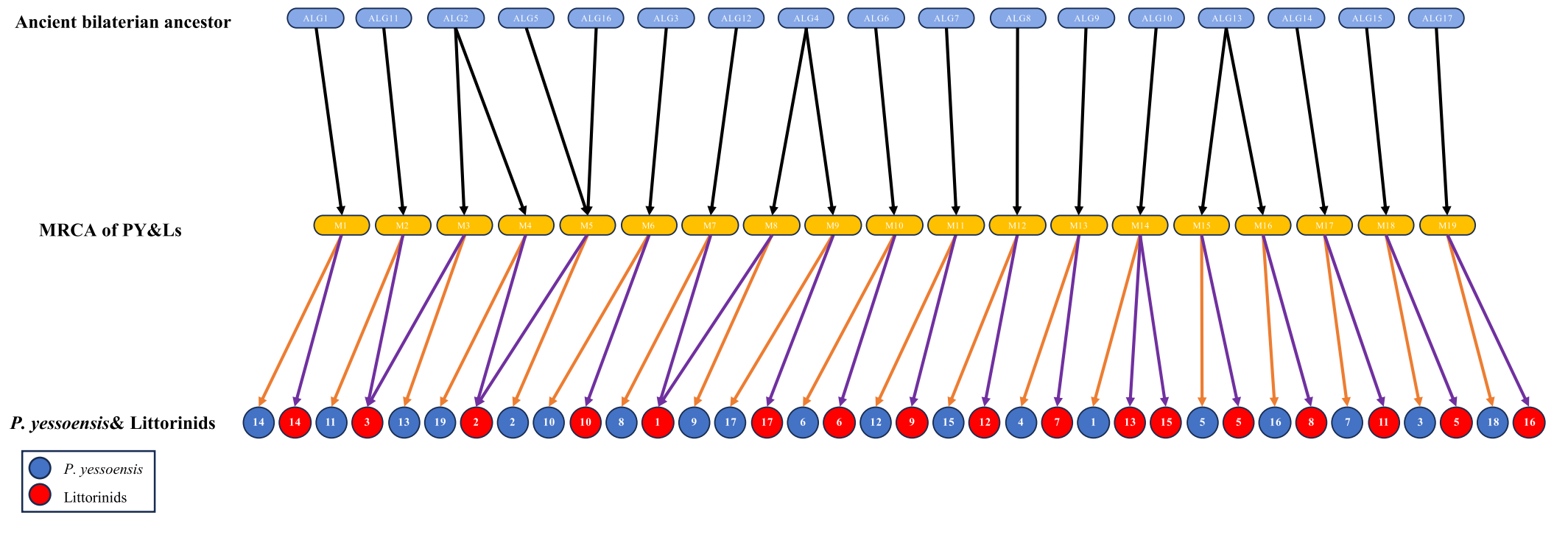 圖3-簡約核型演化歷程推演及濱螺和扇貝共同祖先(MRCA of PY &Ls)核型構建