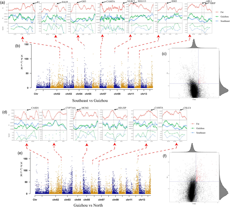 揭示關鍵適應性基因:在貴州和華北群體中,研究檢測到與干旱、寒冷和病害抗性相關的選擇信號基因(如CYP716A, CAMTA,HD-ZIP等),解釋了不同地區(qū)無患子群體的環(huán)境適應能力差異。