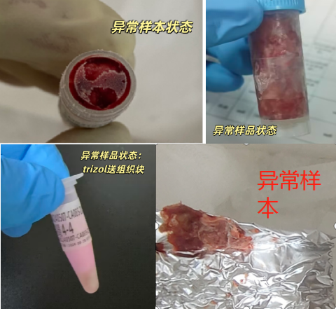 7)凍融組織: 組織凍存后,一旦凍融,核酸降解概率大于 80%,幾乎不可能提取成功,此類組織不建議送樣。請(qǐng)各位老師送樣前注意組織保存狀態(tài), 確保組織未發(fā)生過(guò)凍融情況