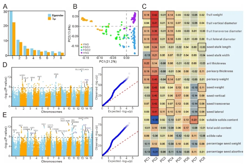綜上所述,該研究揭示了荔枝的遺傳多樣性和群體結(jié)構(gòu),通過全面的基因組分析和表型分析,闡明了果實(shí)品質(zhì)的遺傳基礎(chǔ)。這些發(fā)現(xiàn)為理解荔枝果實(shí)品質(zhì)的遺傳基礎(chǔ)提供了寶貴資源和知識,為進(jìn)一步的遺傳改良貢獻(xiàn)了理論基礎(chǔ)。