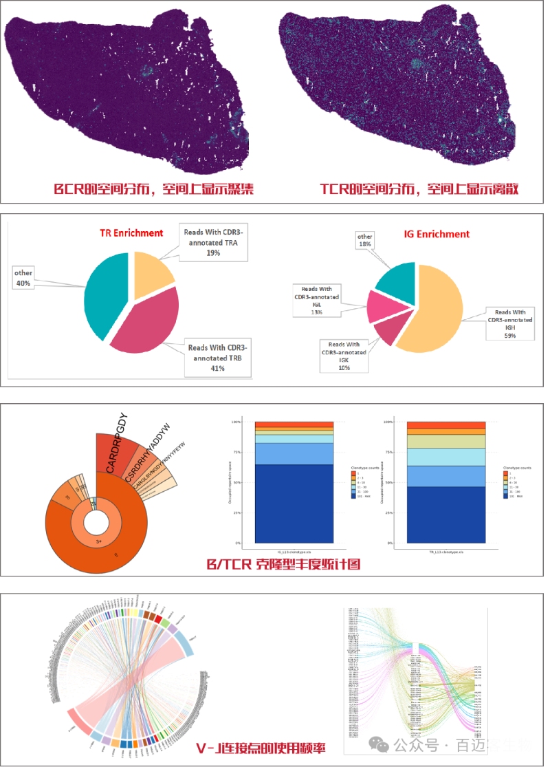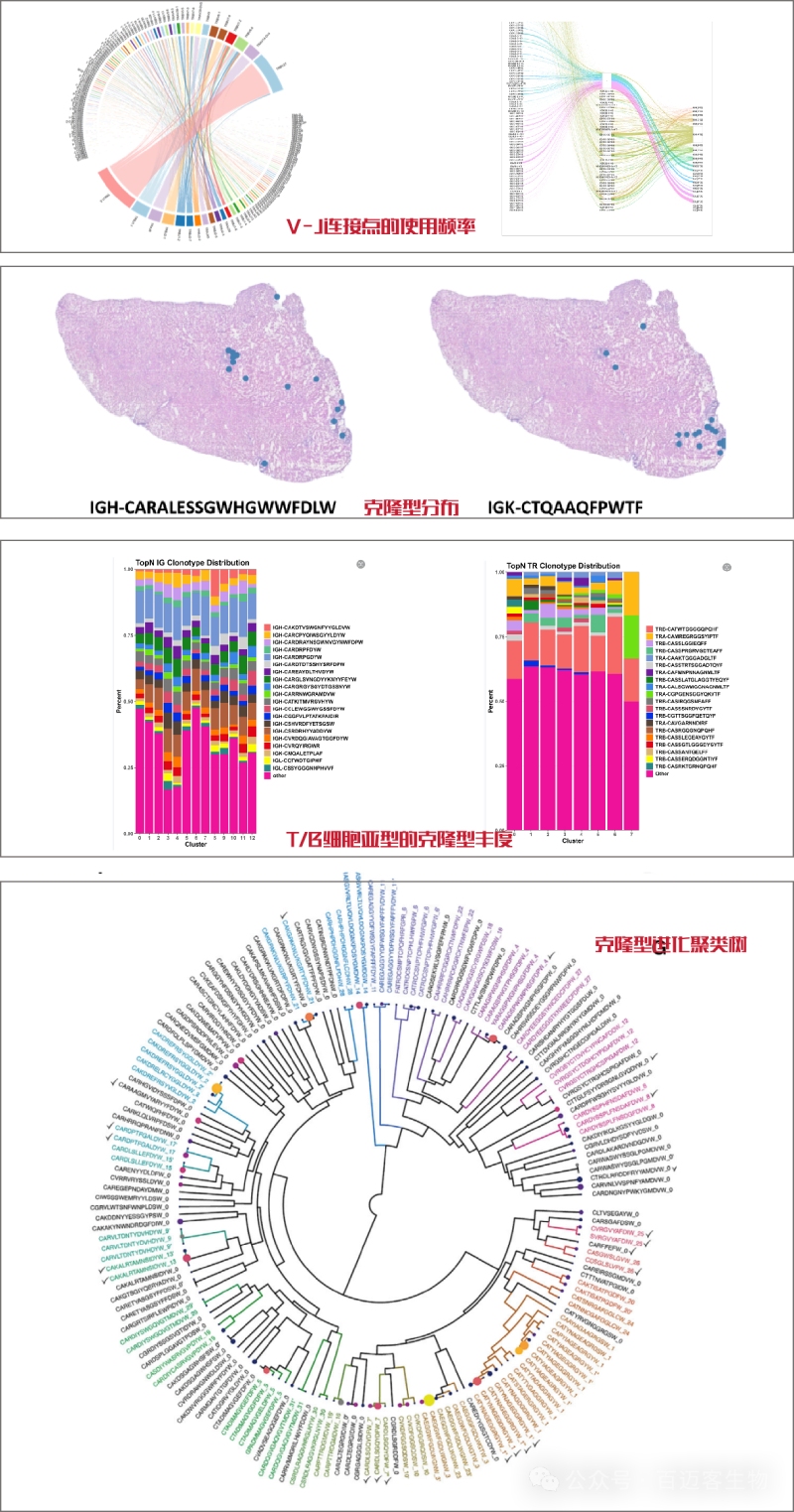 腫瘤樣本我們可以類比為一處具有復(fù)雜地貌的特殊地理環(huán)境,不同的環(huán)境造就了各種細(xì)胞的不同狀態(tài),而T/B細(xì)胞在不同的“選擇壓力”下邊進(jìn)行了不同的“適應(yīng)性進(jìn)化”。對不同生態(tài)位的T/B細(xì)胞尤其是TCR/BCR進(jìn)行測定,有助于我們?nèi)ソ沂久庖呒?xì)胞的克隆起源和進(jìn)化過程。例如,通過分析TCR的VDJ重排,可以追蹤T細(xì)胞克隆的起源和擴(kuò)增過程。這種分析有助于理解免疫細(xì)胞在不同生理和病理狀態(tài)下的動(dòng)態(tài)變化。