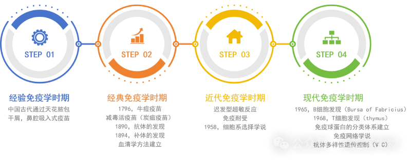 這是最早關(guān)于人類免疫學(xué)應(yīng)用的記錄。公元前?400?年,中國可能已有人痘苗接種預(yù)防天花的方法,到?16?世紀(jì)明朝隆慶年間,人痘接種法得到重大改進(jìn)并廣泛應(yīng)用,17?世紀(jì)傳入俄國、朝鮮、日本、土耳其和英國等國家,至18世紀(jì)末結(jié)束經(jīng)驗(yàn)免疫學(xué)時(shí)期,隨后免疫學(xué)又經(jīng)歷了經(jīng)典免疫學(xué)時(shí)期,近代免疫學(xué)時(shí)期,直到1965年/1968年?B細(xì)胞/T細(xì)胞的發(fā)現(xiàn)開啟了現(xiàn)代免疫學(xué)時(shí)期。
