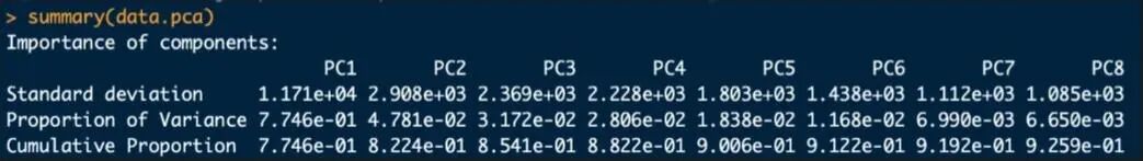 prcomp??函數(shù)的返回值是一個(gè)特殊的對(duì)象,可以利用summary?函數(shù)來(lái)查看分析的結(jié)果。