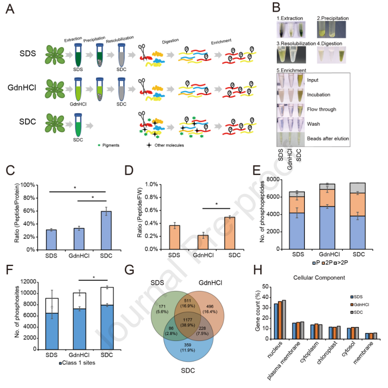 從植物組織中高效提取蛋白質(zhì)是深入分析植物蛋白質(zhì)組和磷酸化蛋白質(zhì)組的第一步和關鍵一步。為此,作者比較了SDS、GdnHCl和SDC等不同變性劑對擬南芥葉片中蛋白質(zhì)的提取性能。結果發(fā)現(xiàn)SDS-和SDC-提取的蛋白的性能相似,但優(yōu)于GdnHCl。植物樣品相較于動物樣品含有較低濃度的蛋白質(zhì),因此作者優(yōu)化了磷酸化蛋白質(zhì)組的提取和富集的方法,即用SDS或GdnHCl緩沖液提取的蛋白質(zhì)樣品,在蛋白質(zhì)消化和隨后的磷酸肽富集之前,必須去除變性劑(圖1A)。接著用氯仿-甲醇沉淀提取的樣品,去除變性劑和其他干擾生物分子(圖1A和1B)。而作者通過實驗發(fā)現(xiàn),SDC法提取的蛋白樣本不需要經(jīng)過氯仿-甲醇沉淀,而鑒定到的磷酸化蛋白更多,同時需要的植物材料更少。因此作者認為SDC法更節(jié)省成本達到更好的效果,并在番茄、水稻、綠藻等生物中得到驗證,從而確定了磷酸化蛋白組學的方法,稱之為GreenPhos。